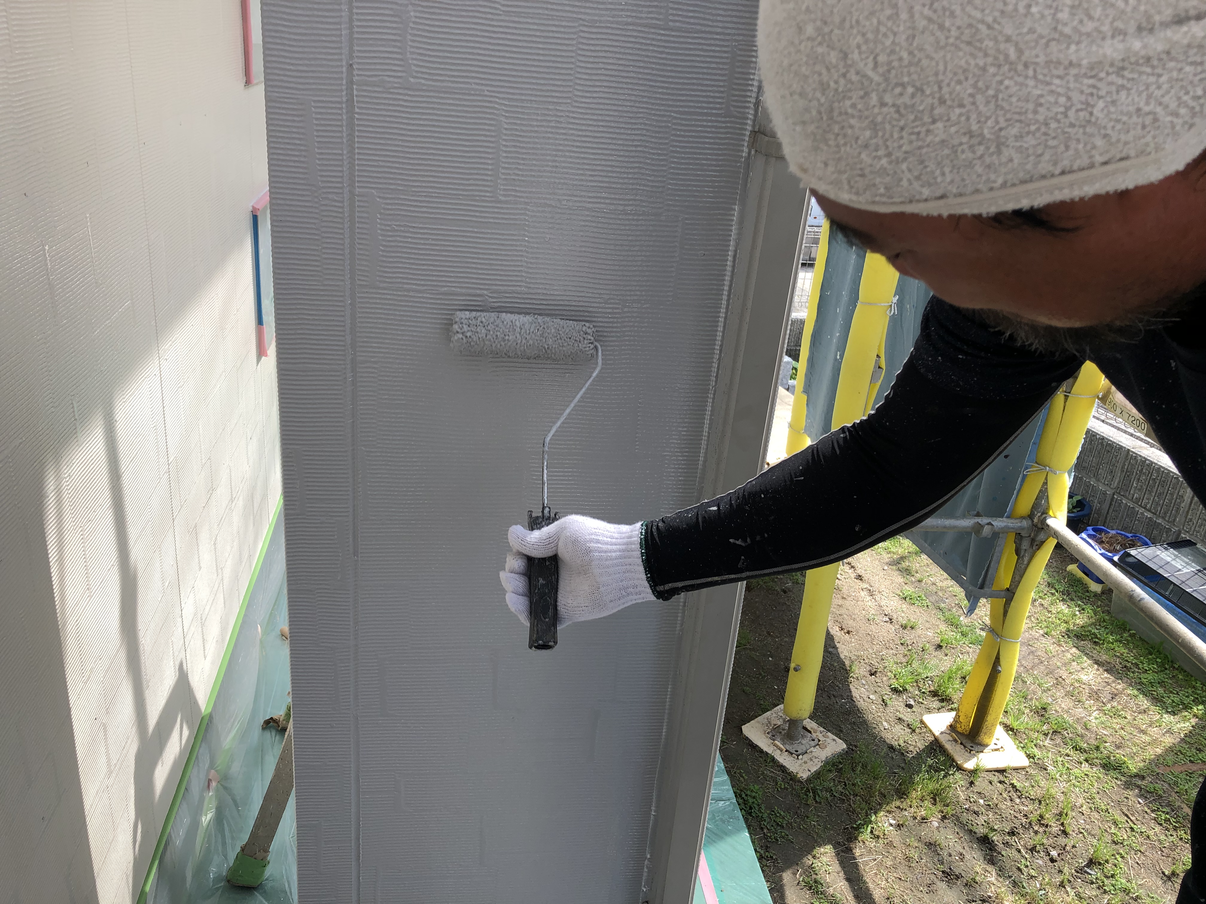 現在は、破風板、雨樋の塗装が終わり外壁面の下塗り(シーラー)中塗り作業中です。