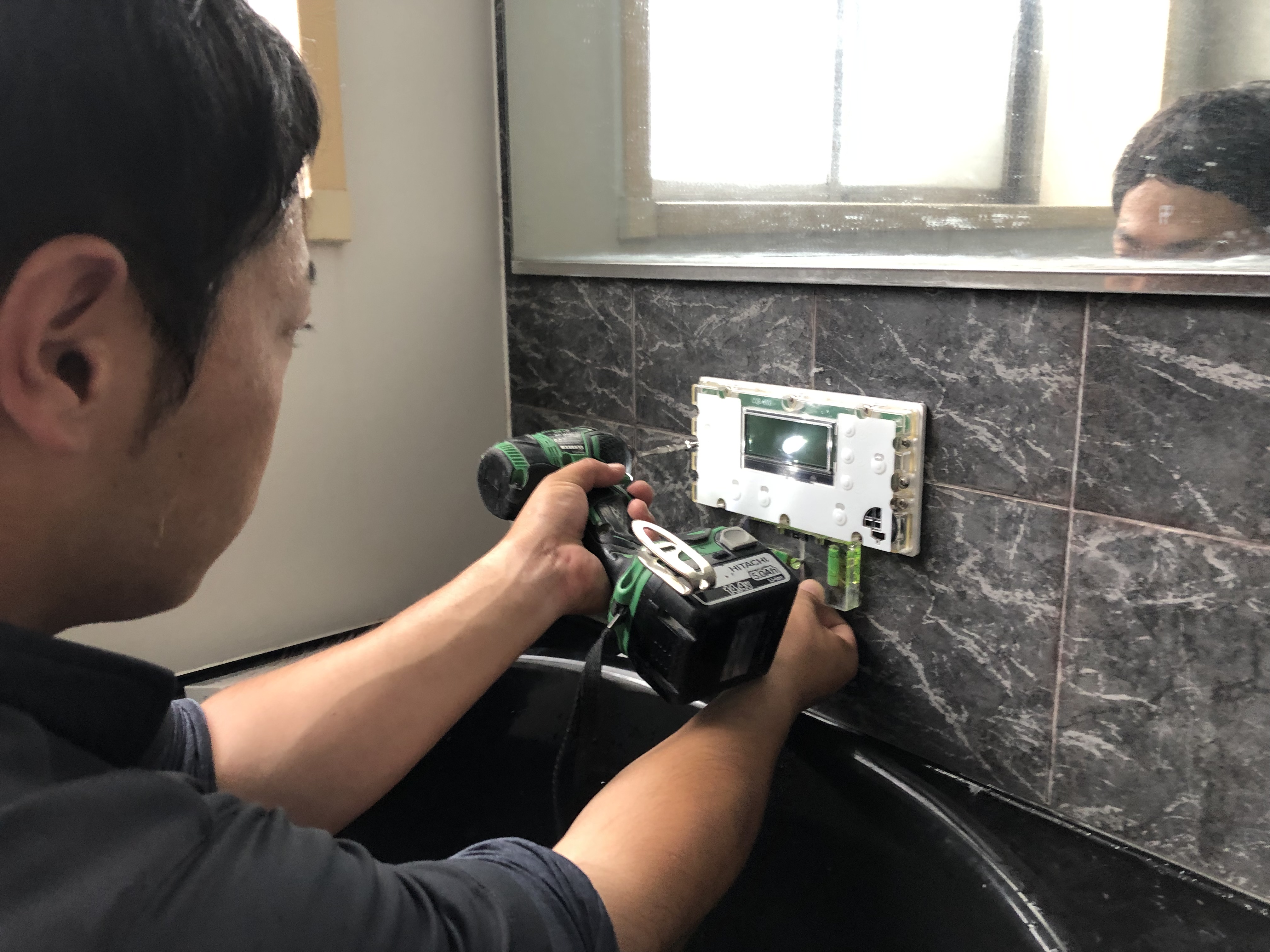浴室リモコン取り替え作業です。ズレがないようレベルをみて取付します^ ^