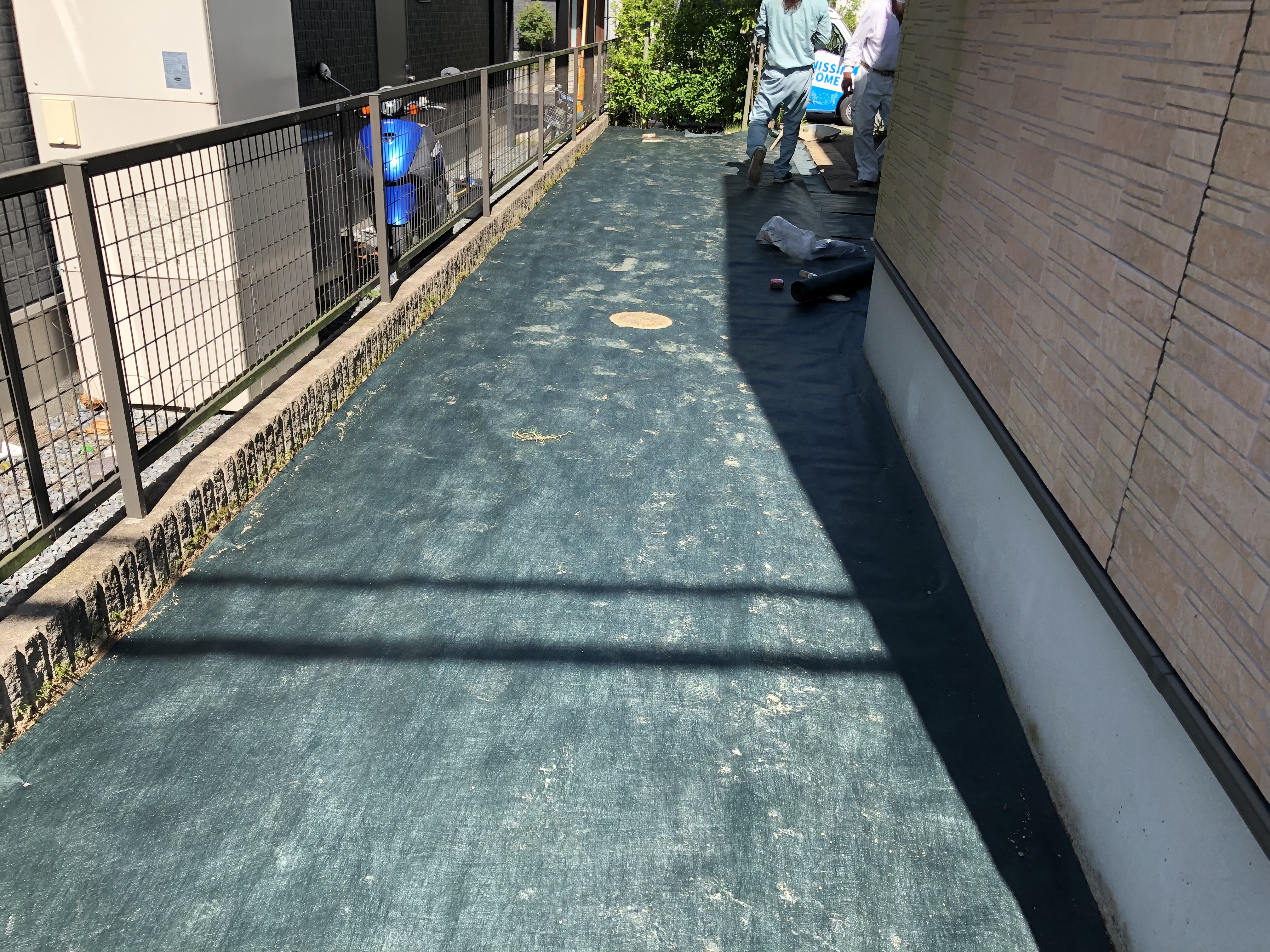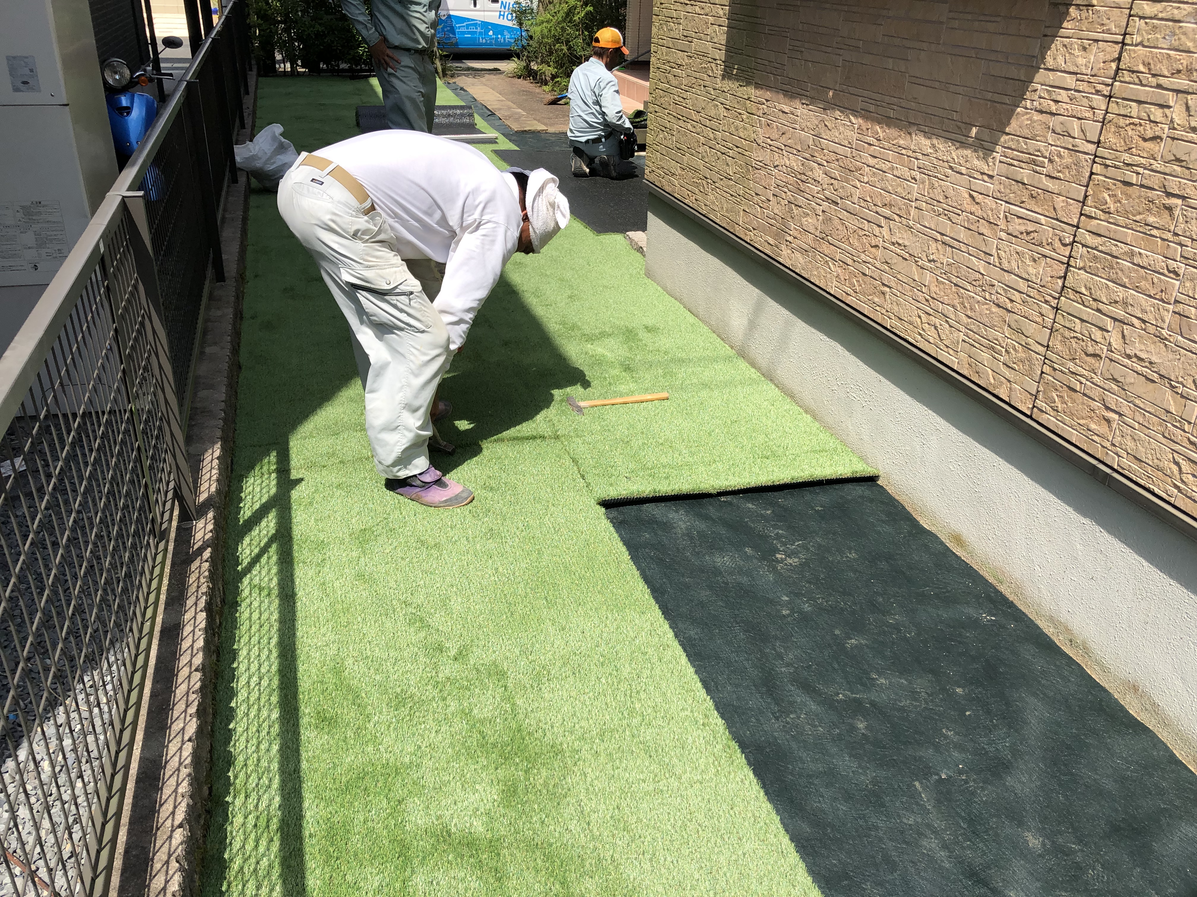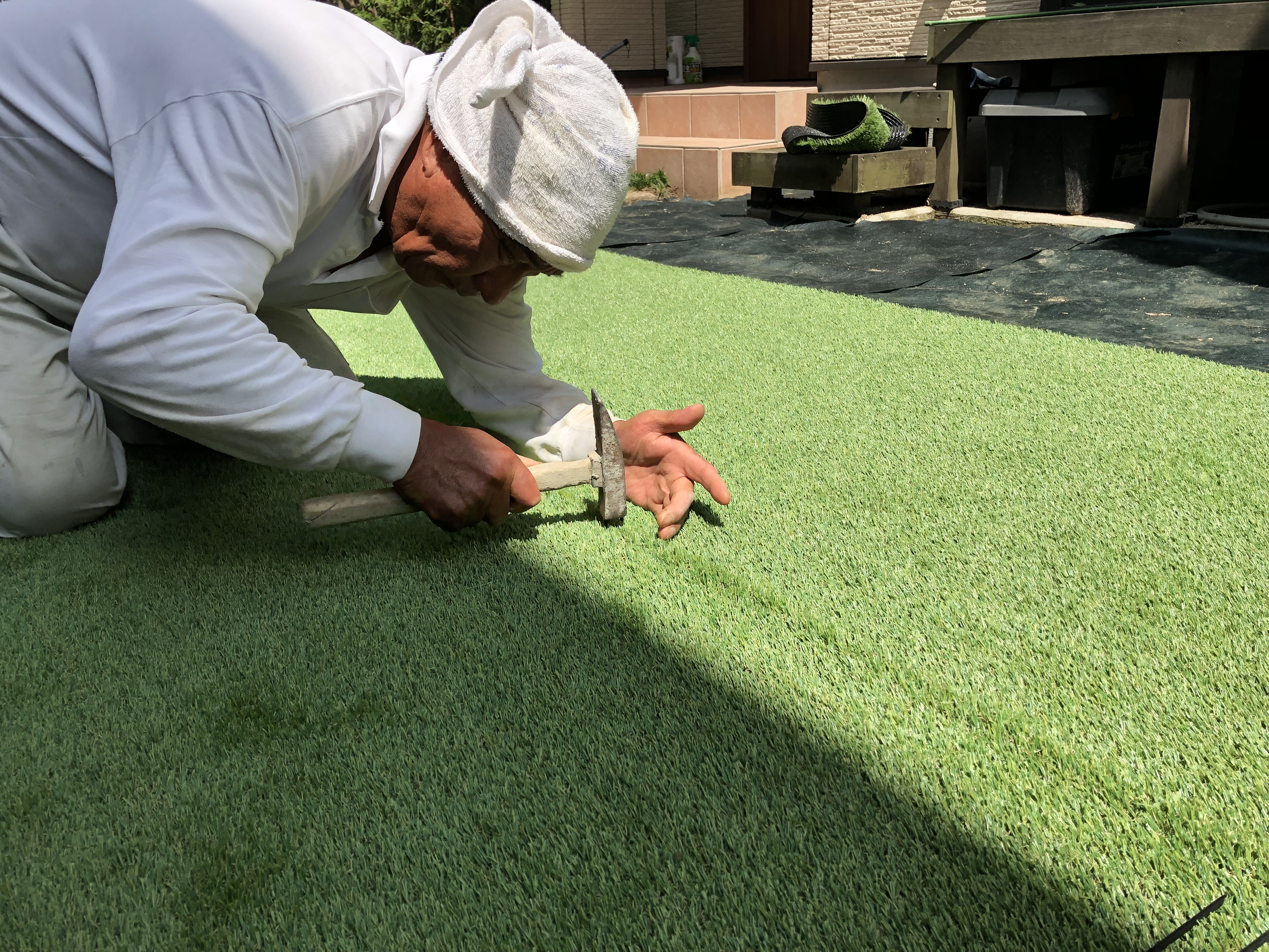 次に人工芝の前に防草シートを下に敷いて釘でとめていきます