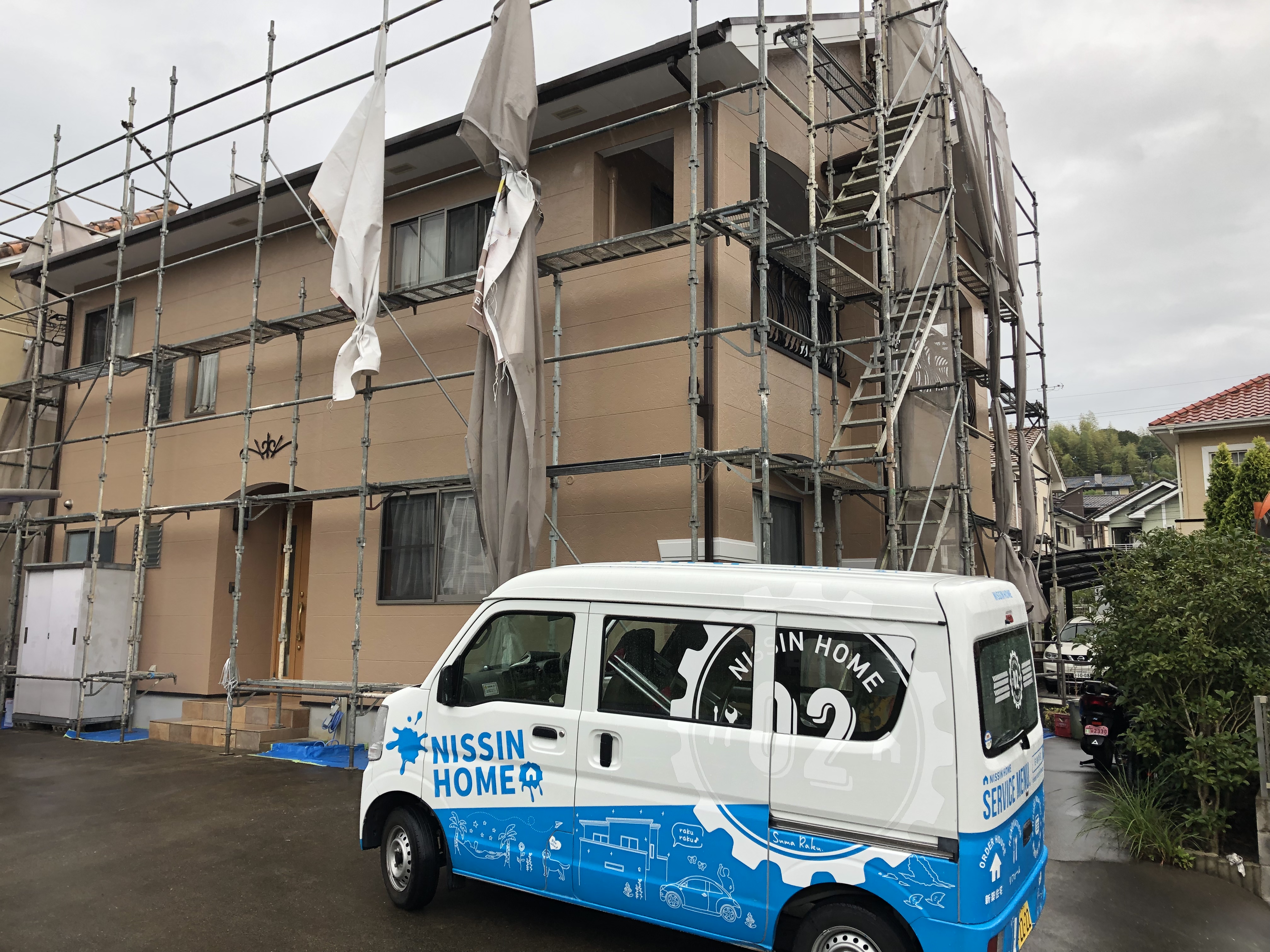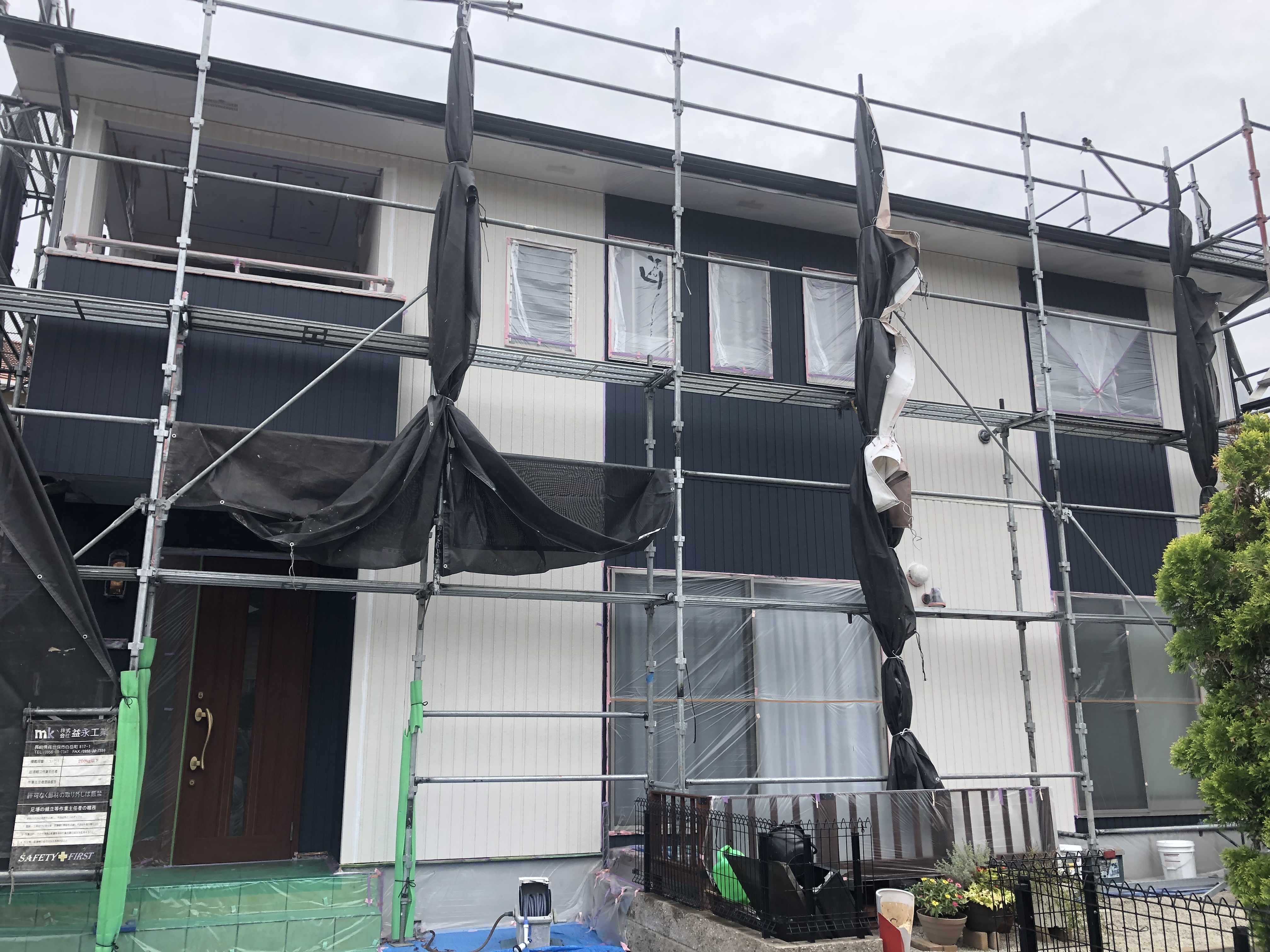 外壁塗装現場は足場シートをしっかり養生させて頂いおります。外構工事現場も飛んでいく物はないか再確認させて頂きました✨