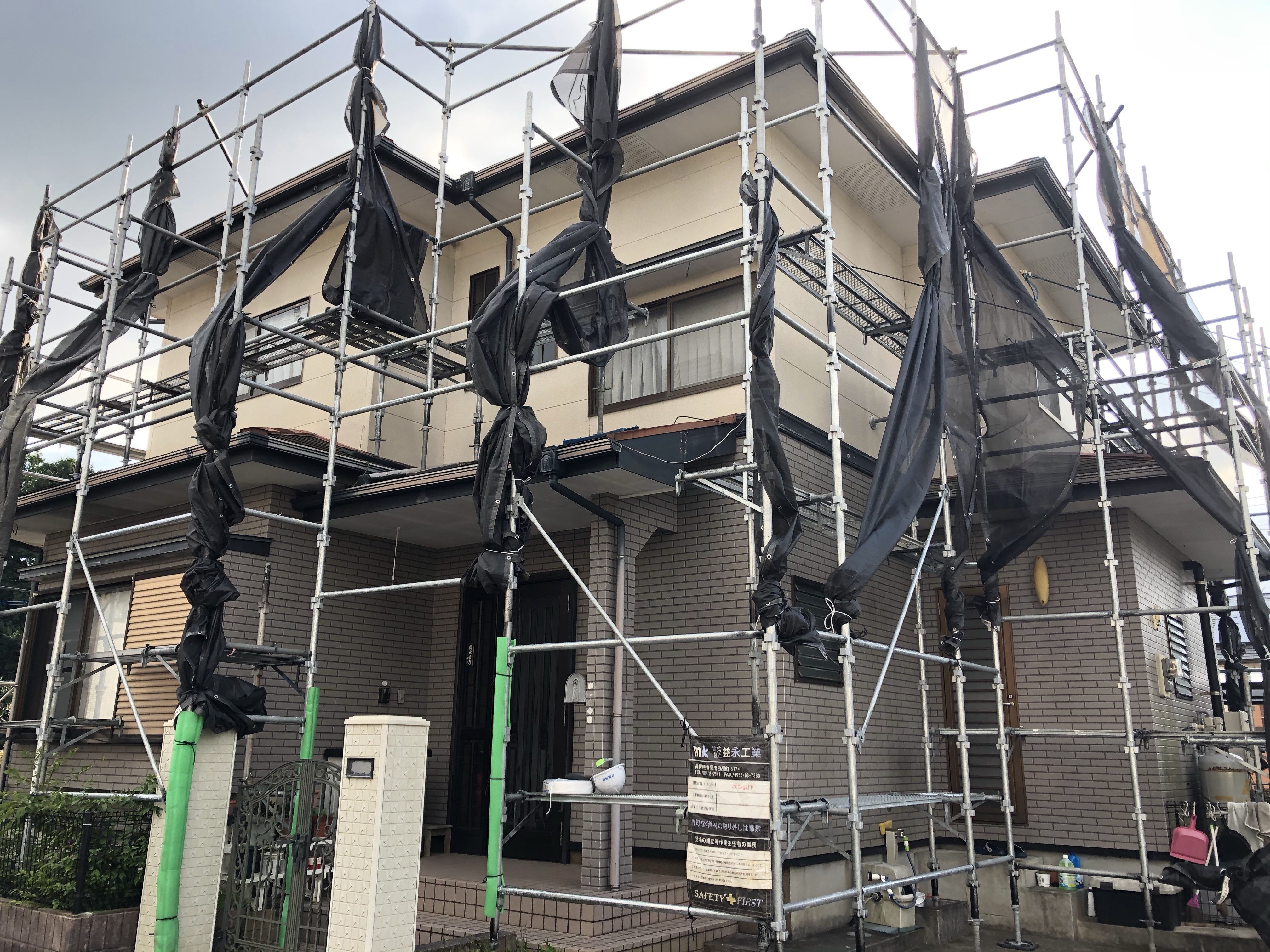 外壁は、2トーンカラーにて吹き付け塗装です。遠くから見るとわかりずらいですが、細かく柄が入っており、とても落ち着いた高級感がある印象にみえます(^^)