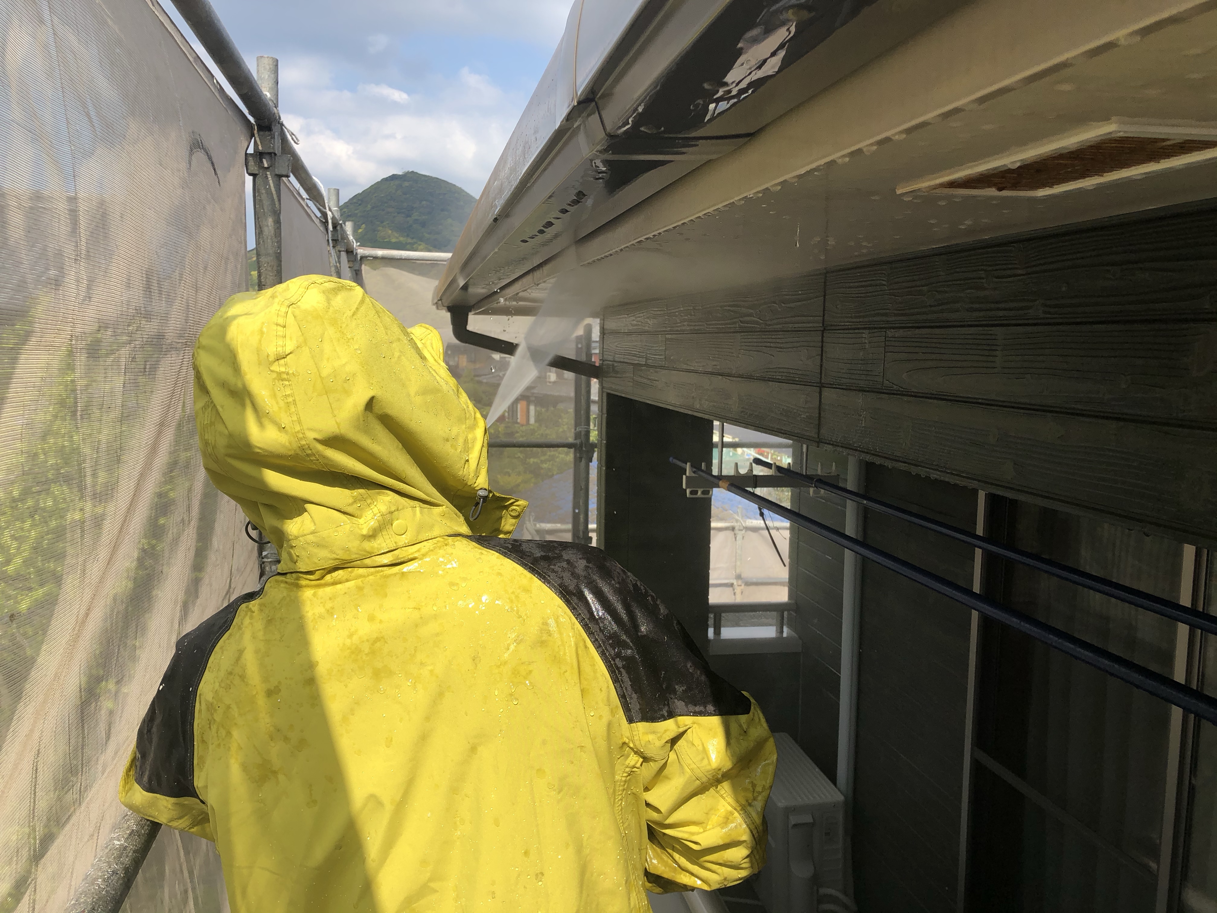 足場工事仮設後にまず高圧洗浄にて洗い流しております✨