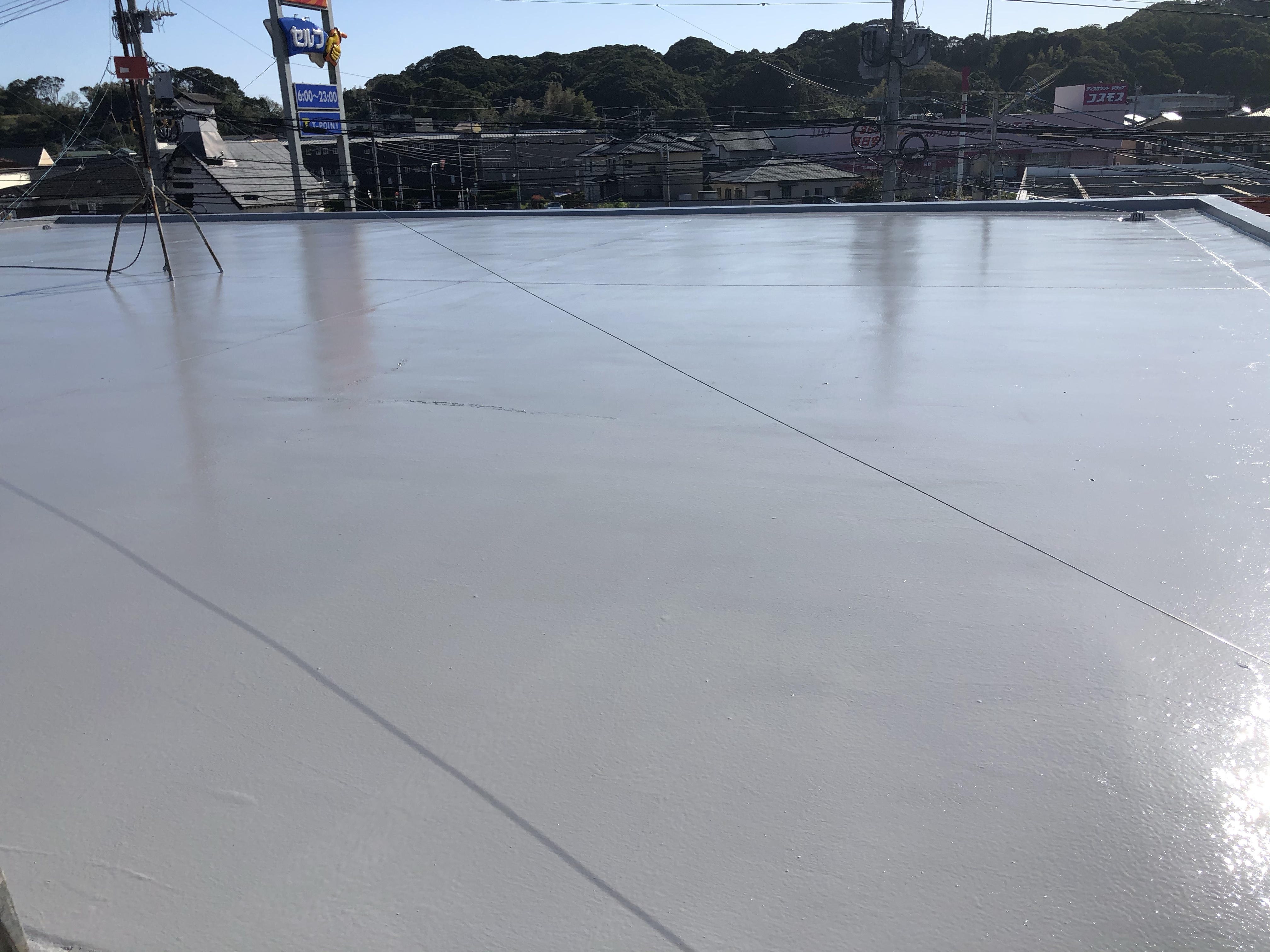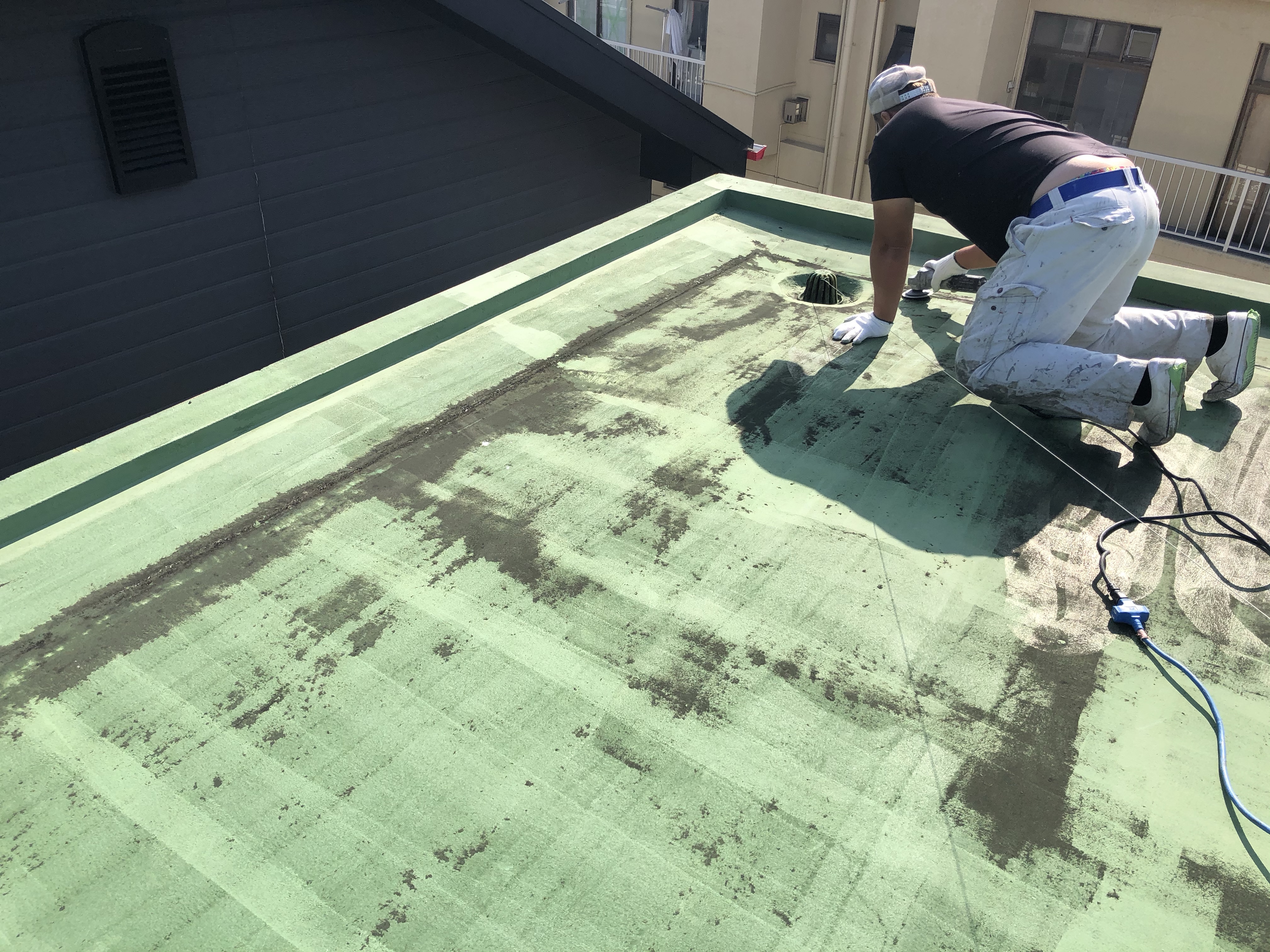 下地処理後、下塗り、上塗り作業にてトップコート防水にてローラー塗りします✨ 丁寧な作業にて工事が進んでおりました😊