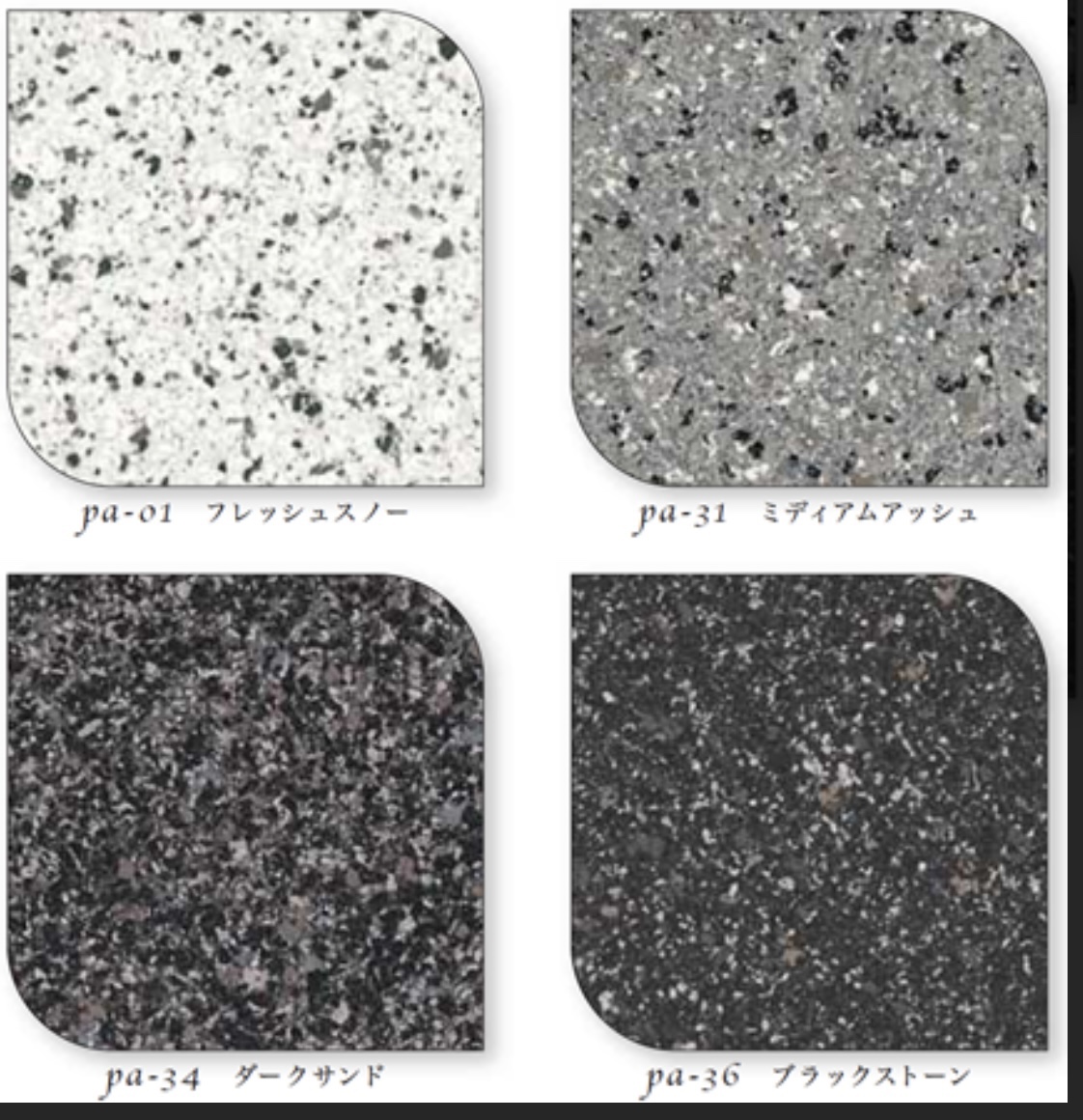 もう一つはダークサンドです。黒色よりグレーと黒色の中間色で紺色に近い色合いになります(o^^o)重量感がありますが、暗いイメージは全くなく、石調で高級感がある雰囲気になります
