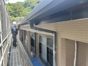 2F部分の壁塗装が終わり、破風板や雨樋などの付帯部分の塗装を行っています❗️