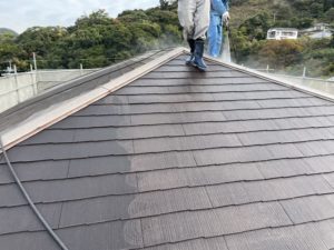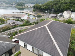 屋根もコロニアル瓦にて、劣化が見られ一部ひび割れも見られておりました。コロニアル瓦は特に早めの塗装を行わないと劣化しすぎると、瓦が脆く割れやすくなりやすいです