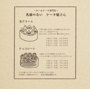 お店の名前は、名前がまだ決まってなかったところから、名前のないケーキ屋さんというお店の名前にされたようでした(o^^o)