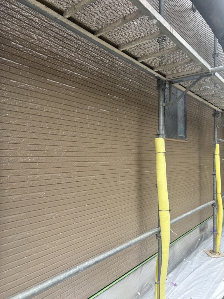 シーリング打ち替え、外壁下塗りまで終わり、いよいよ仕上げ塗装工程に入っております。