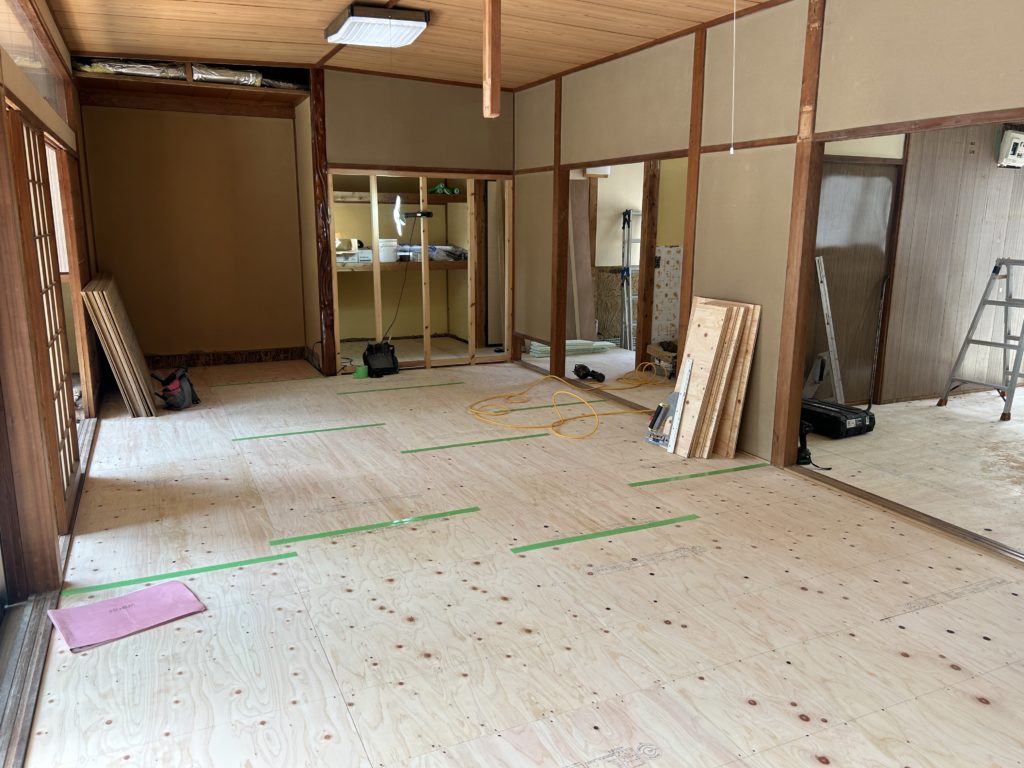床下地の工事までが終わり、いよいよフローリングを貼り始めています