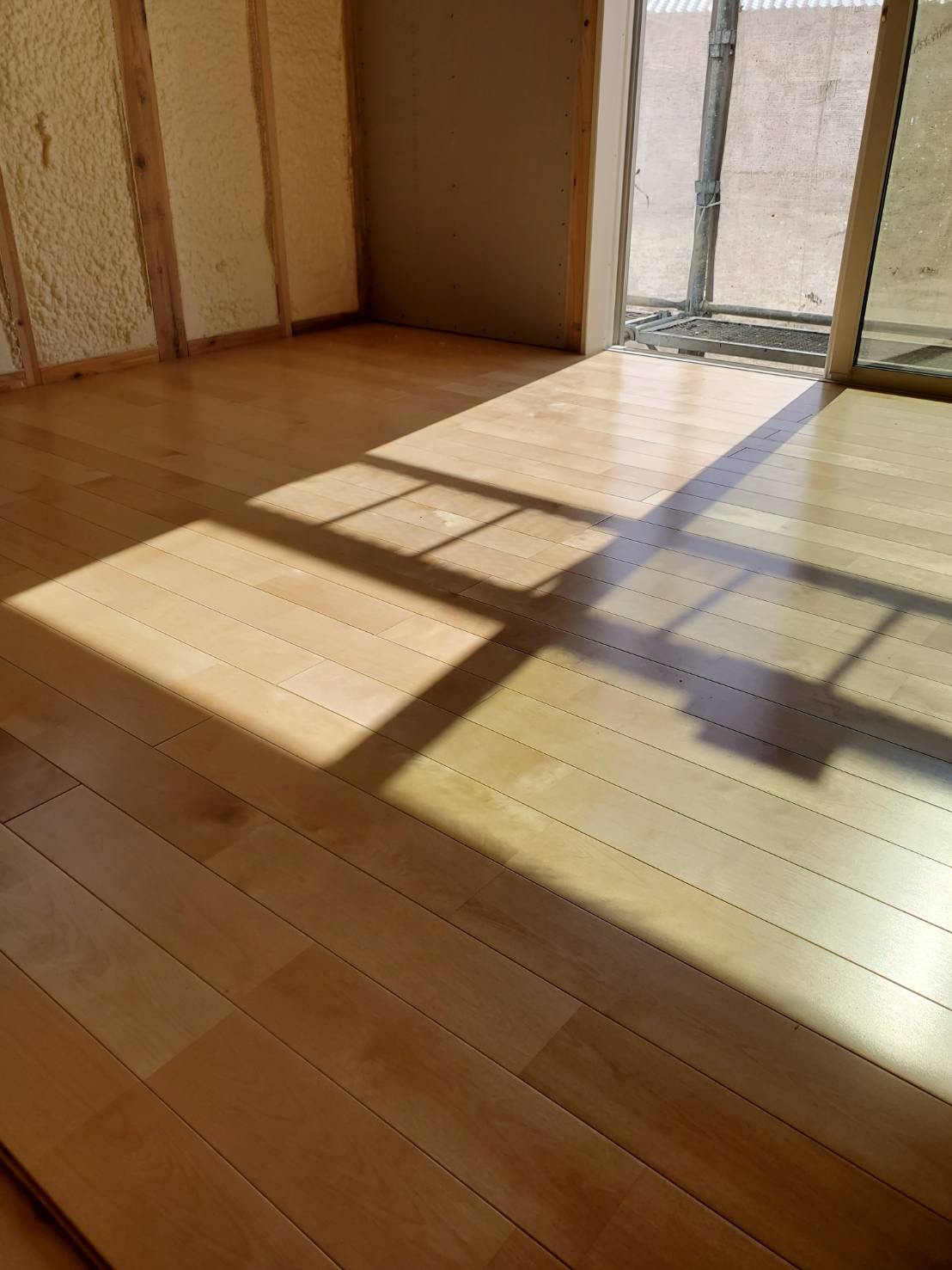 フローリングとは違い無垢材を使う為、大工さんが床を1枚1枚丁寧に貼っております😄💡