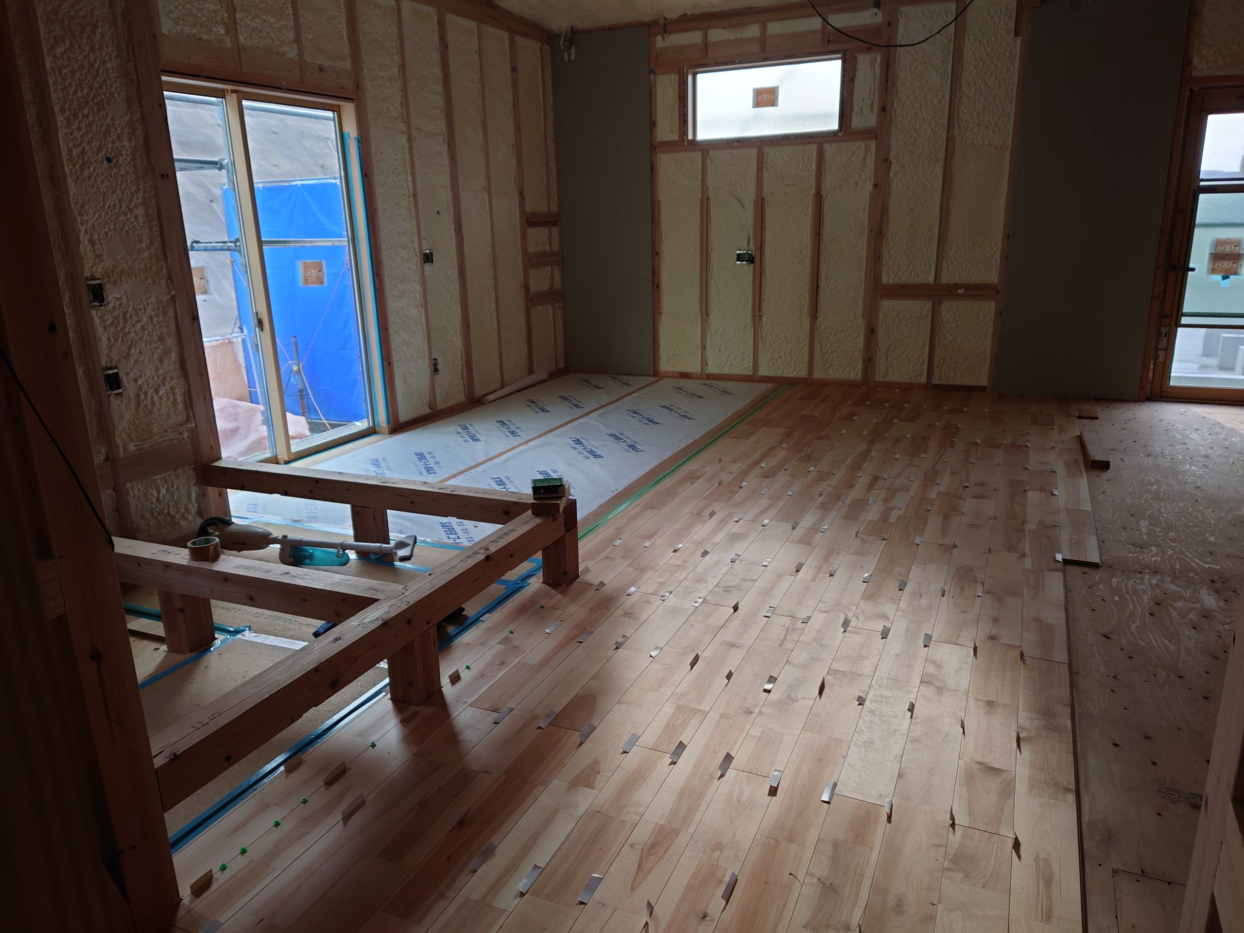 1階の木工事は床貼りが半分程終わってる状態です😎↓