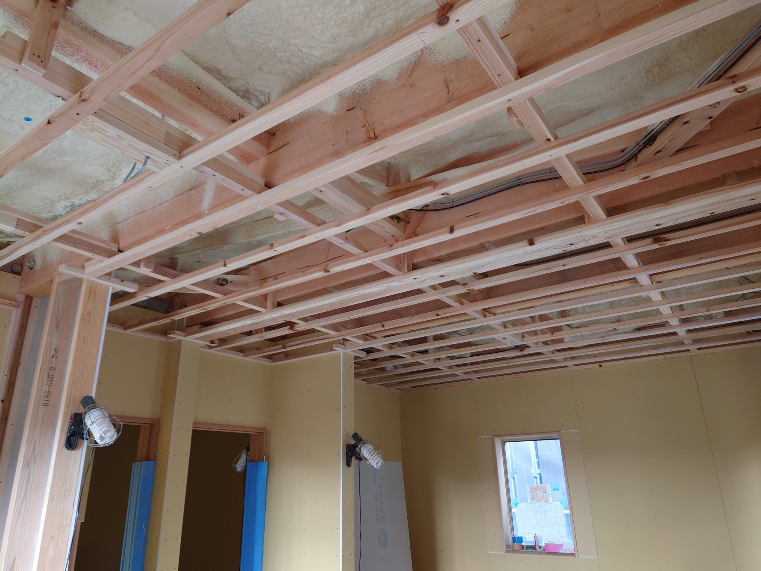 2階の木工事は天井のボードを貼ると、ほぼ終わりです。↓