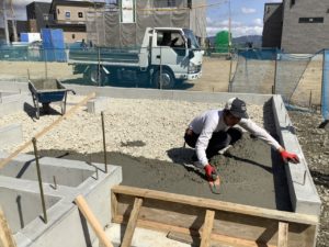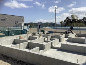 ひうみ町に建設中のモデルハウスも先日テラスの土間増し打ちコンクリート打設作業が終了し基礎工事が完了しました。