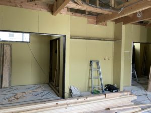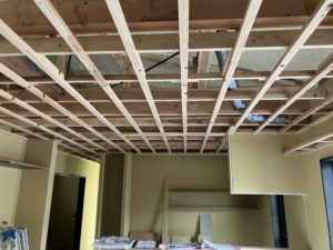 内部は壁下地ボード貼りを終えて天井下地ボードを貼り始めました。