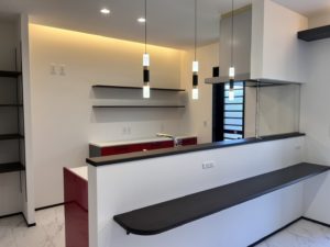 オーナー様のこだわりが光る真っ赤なキッチンがすっきりと馴染んでいます!