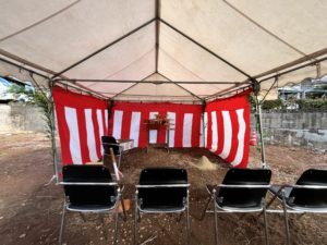 地鎮祭は、工事の安全とご家族の新しい暮らしの繁栄を祈願する大切な儀式です。神主さんが祝詞を読み上げ、土地を清める儀式が進む中、A様ご一家も真剣な面持ちで参加されていました。