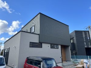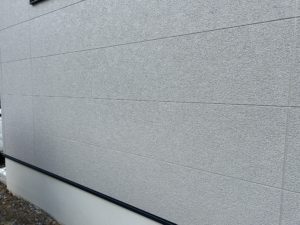 今回一階外壁にご採用頂いた外壁材なんですが、最近人気のKEMWのシックイフラットという柄でNさま邸の色はQFラントチタンダークグレーという色だったんですが、カットサンプルだけで見るより張り終えた全体で見た方がとても良い印象でした