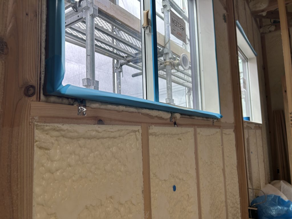 吹付断熱工事も終わっており、窓まわりの隙間にもしっかり断熱材を充填しています