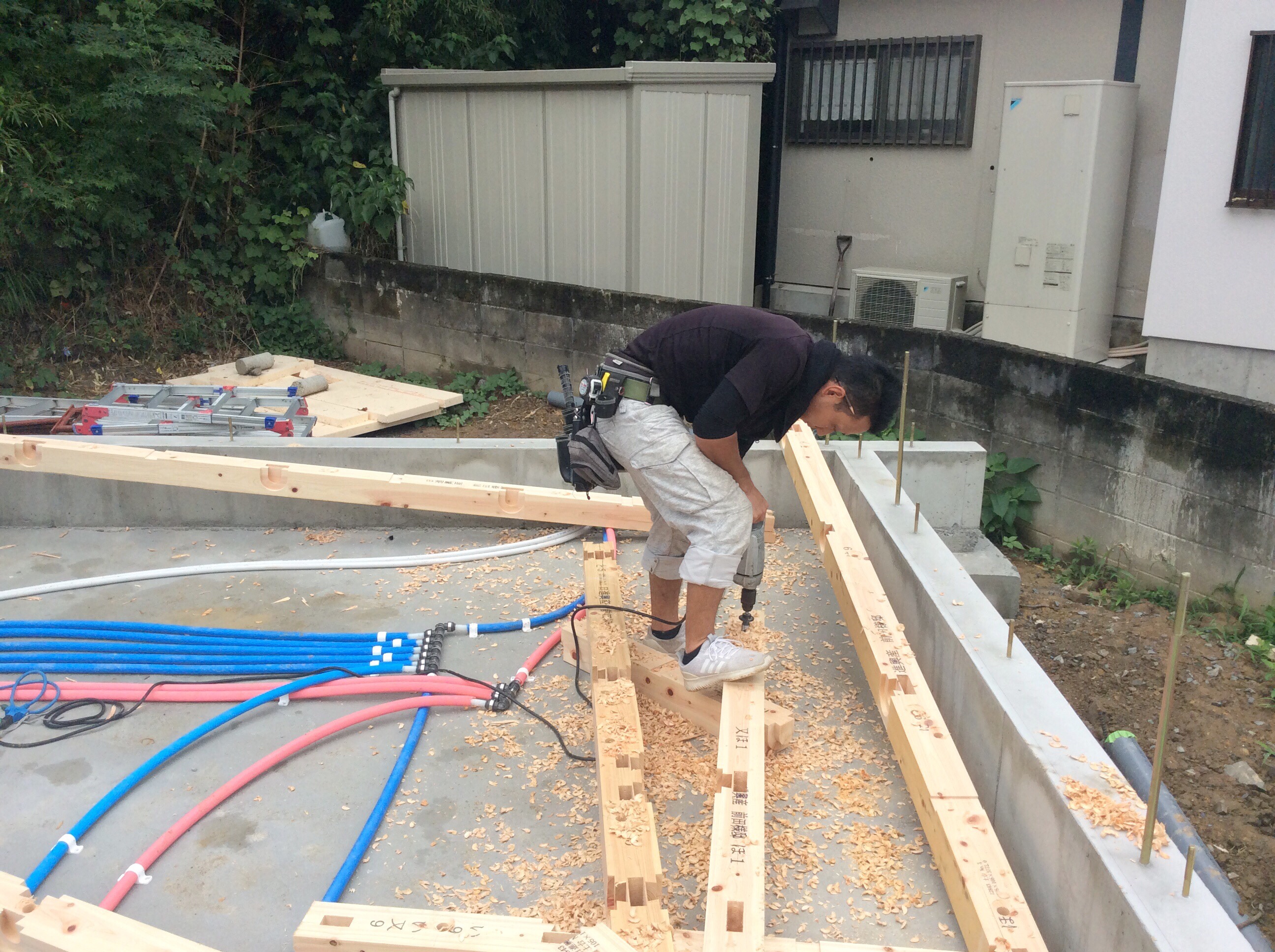 本日から大工さんが入り土台敷きを行なっています