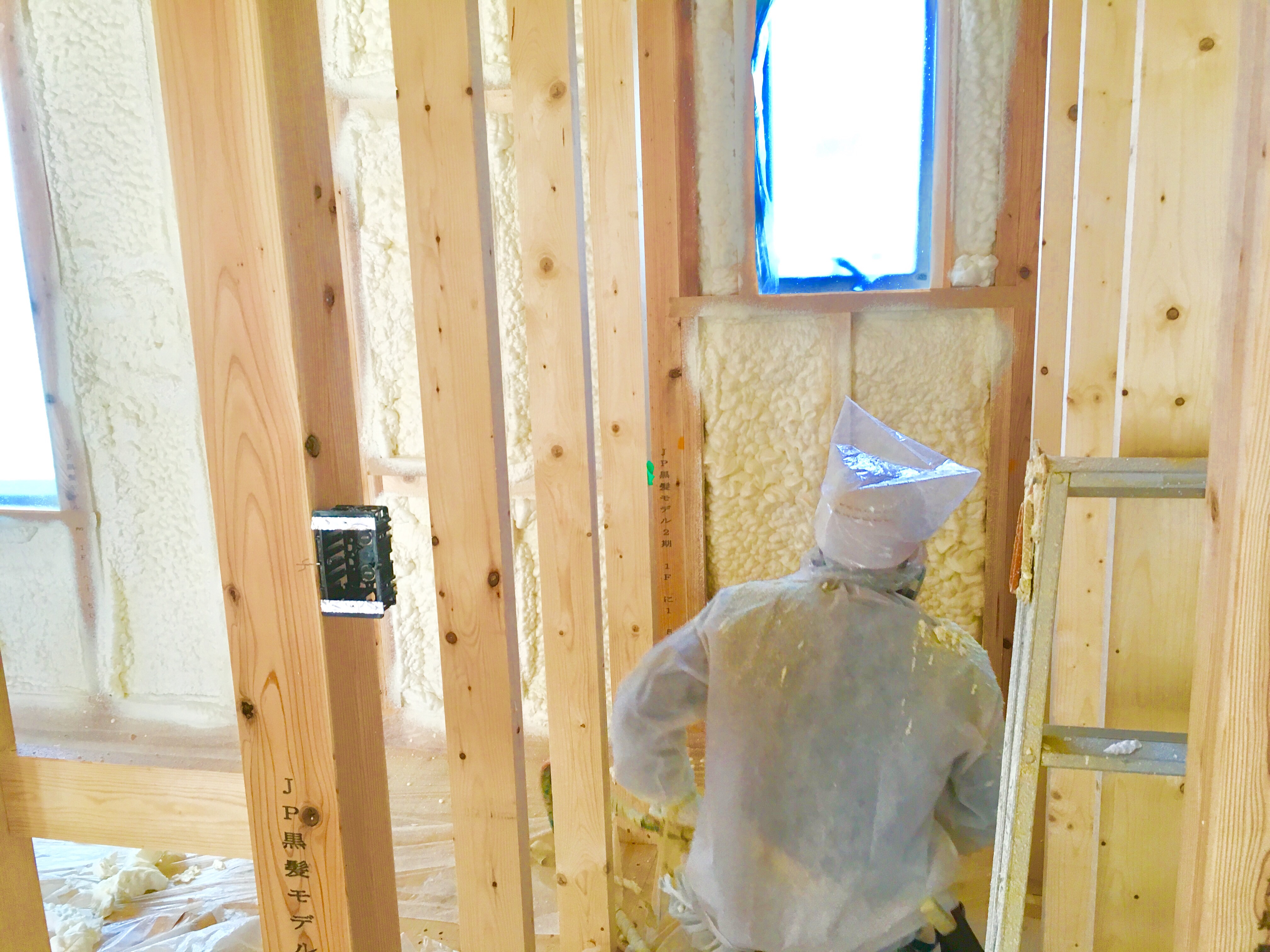 本日、ジョイプレイス黒髪2期モデルハウスは吹きつけ断熱が行われていまた!