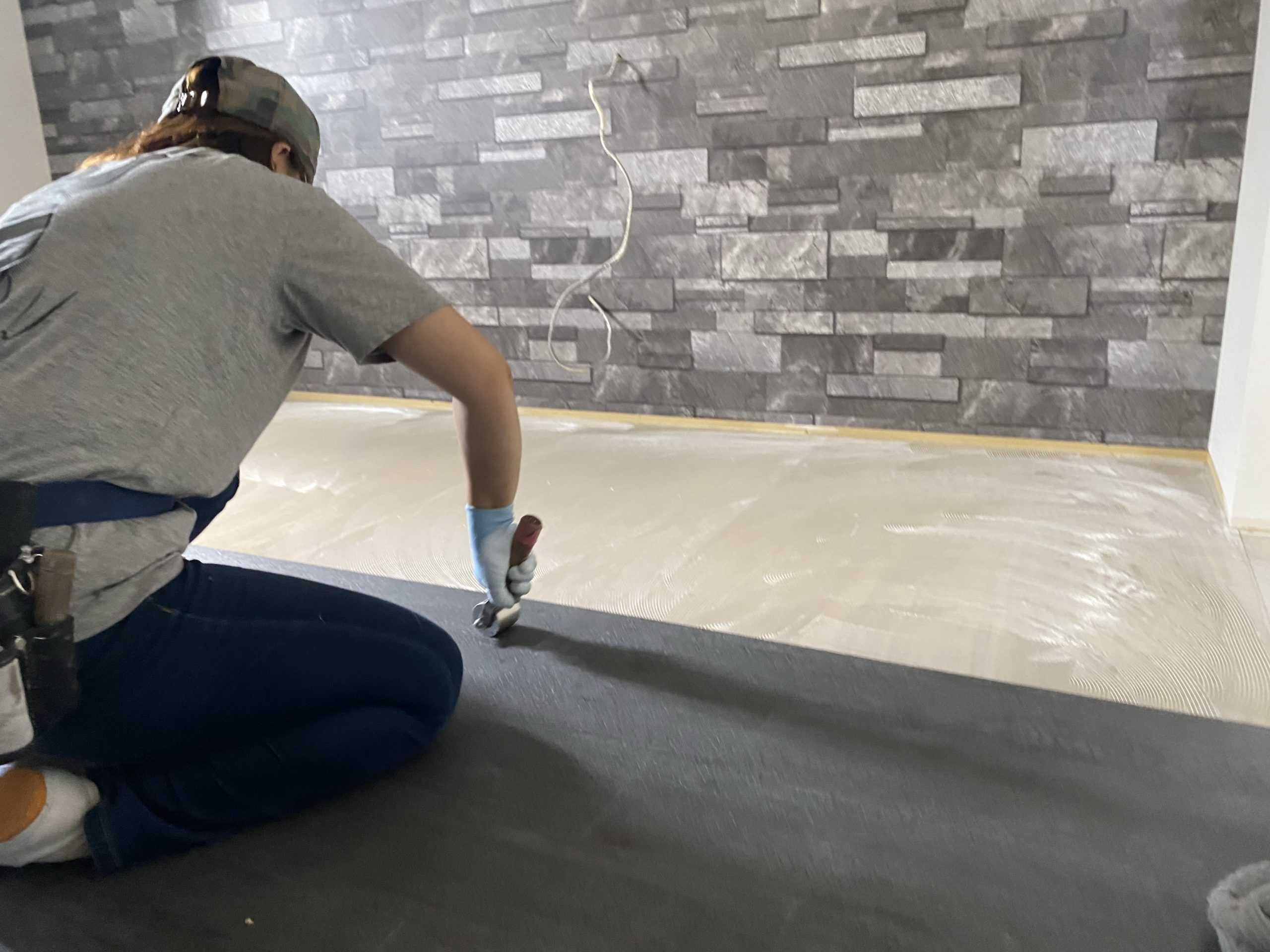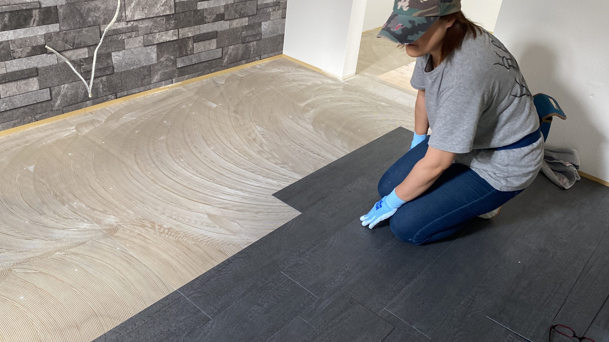 ちょうどフロアタイルを貼る作業風景を撮らせてもらいました!