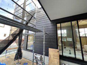外壁のほとんどが完成しており、今回はケイミューのシマンフラットを基調に、アクセントとしてSOLIDを使用しました。