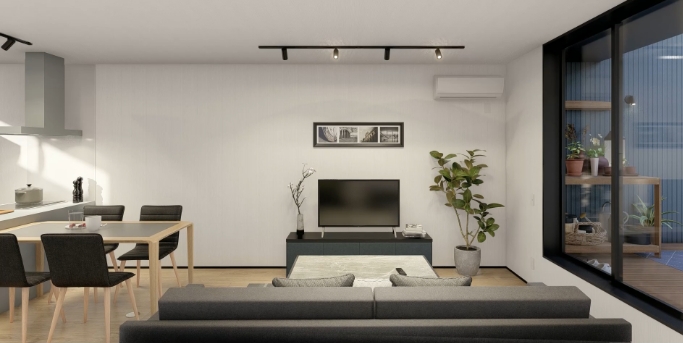 窓を隔てて繋がるリビング&テラスは、視覚的な外との境界を無くし