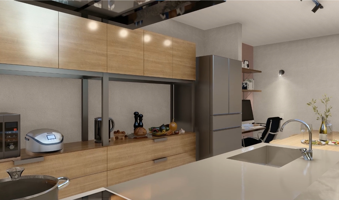 シャープさと木の柔らかさが調和した外観を演出。