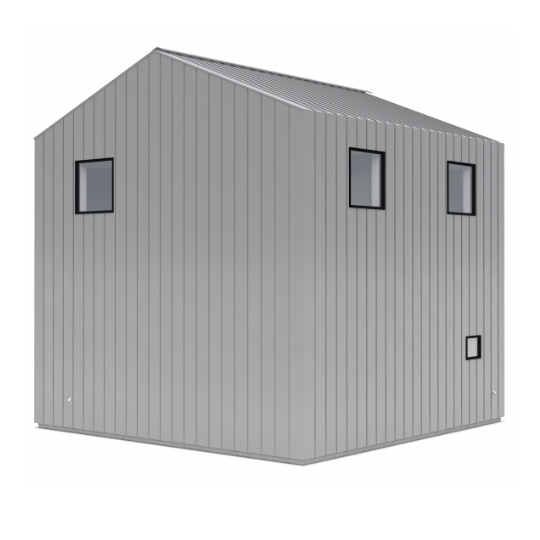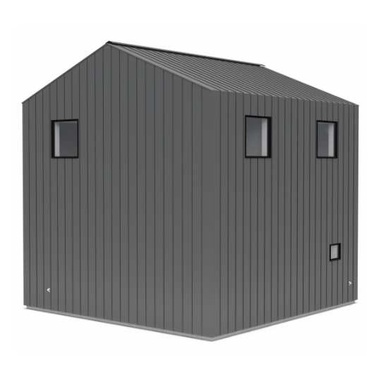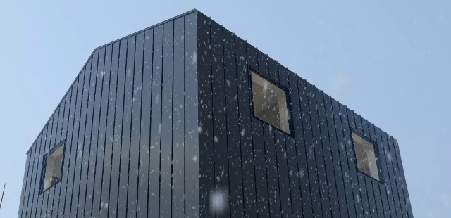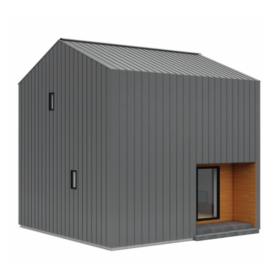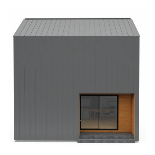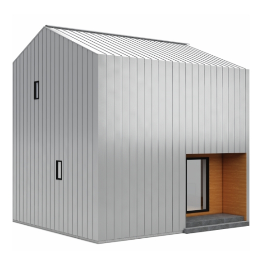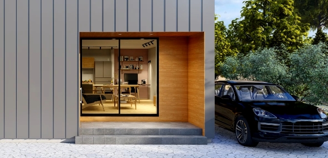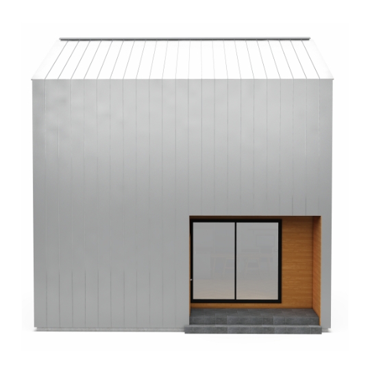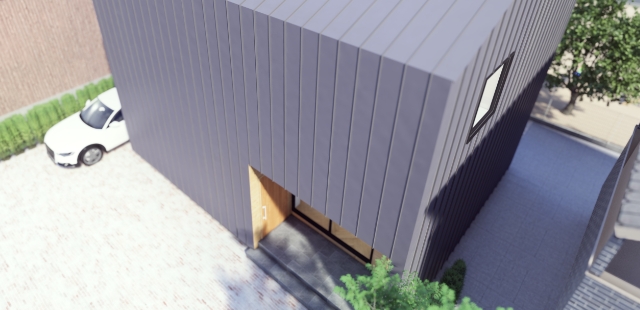 屋根と壁にガルバリウム鋼板、アクセントで玄関周りを木にすることで、