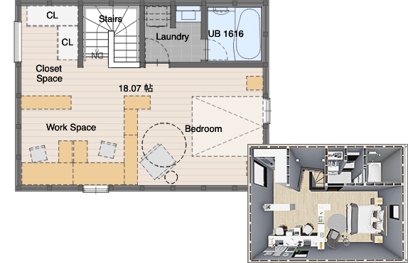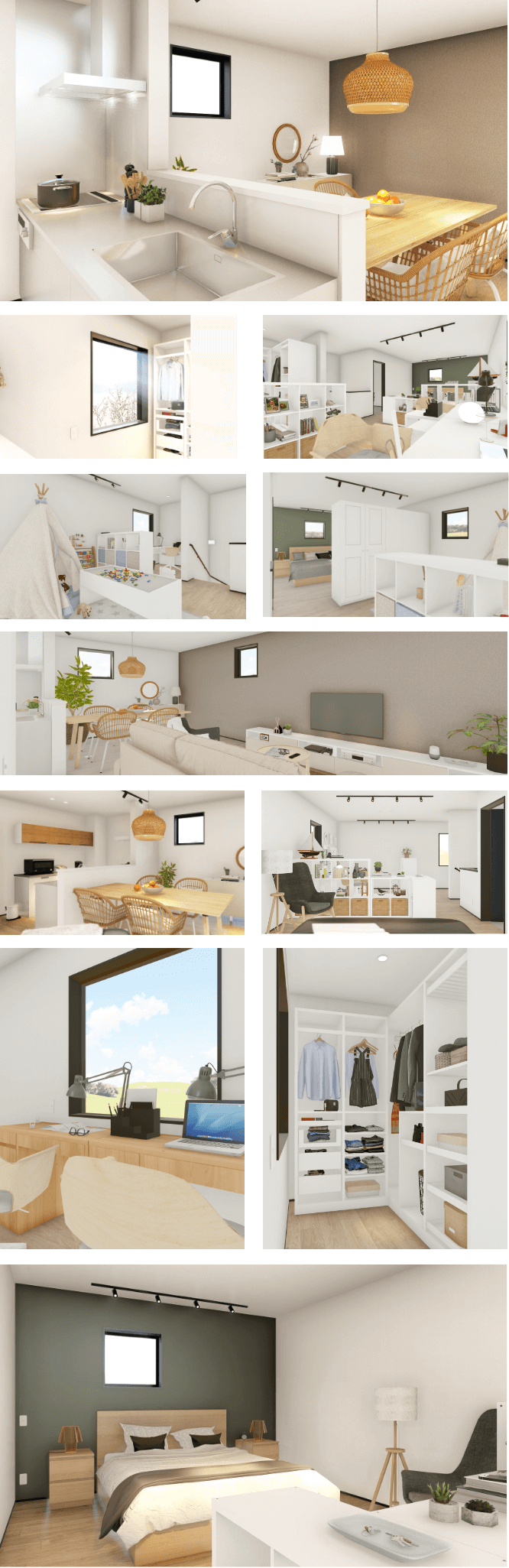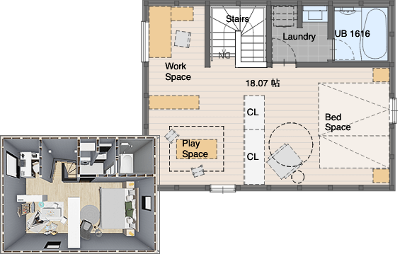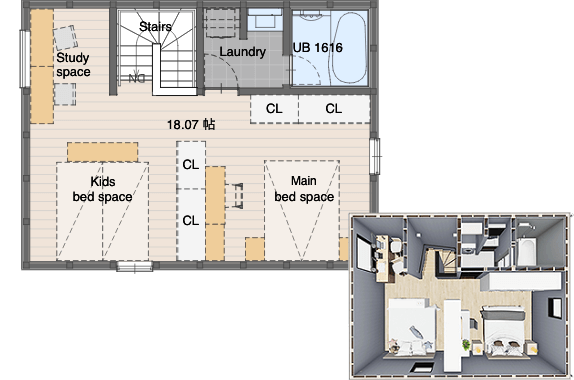 お子さまが成長し、それぞれのエリアが必要になったら2つのベッドコーナーと主寝室を配置したプラン。