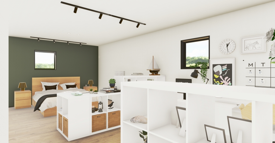 お子さまの勉強が必要になったら、大人のエリアと子供のエリアを分けてレイアウト。お子さま二人のベッドスペースとスタディスペースを設けています。