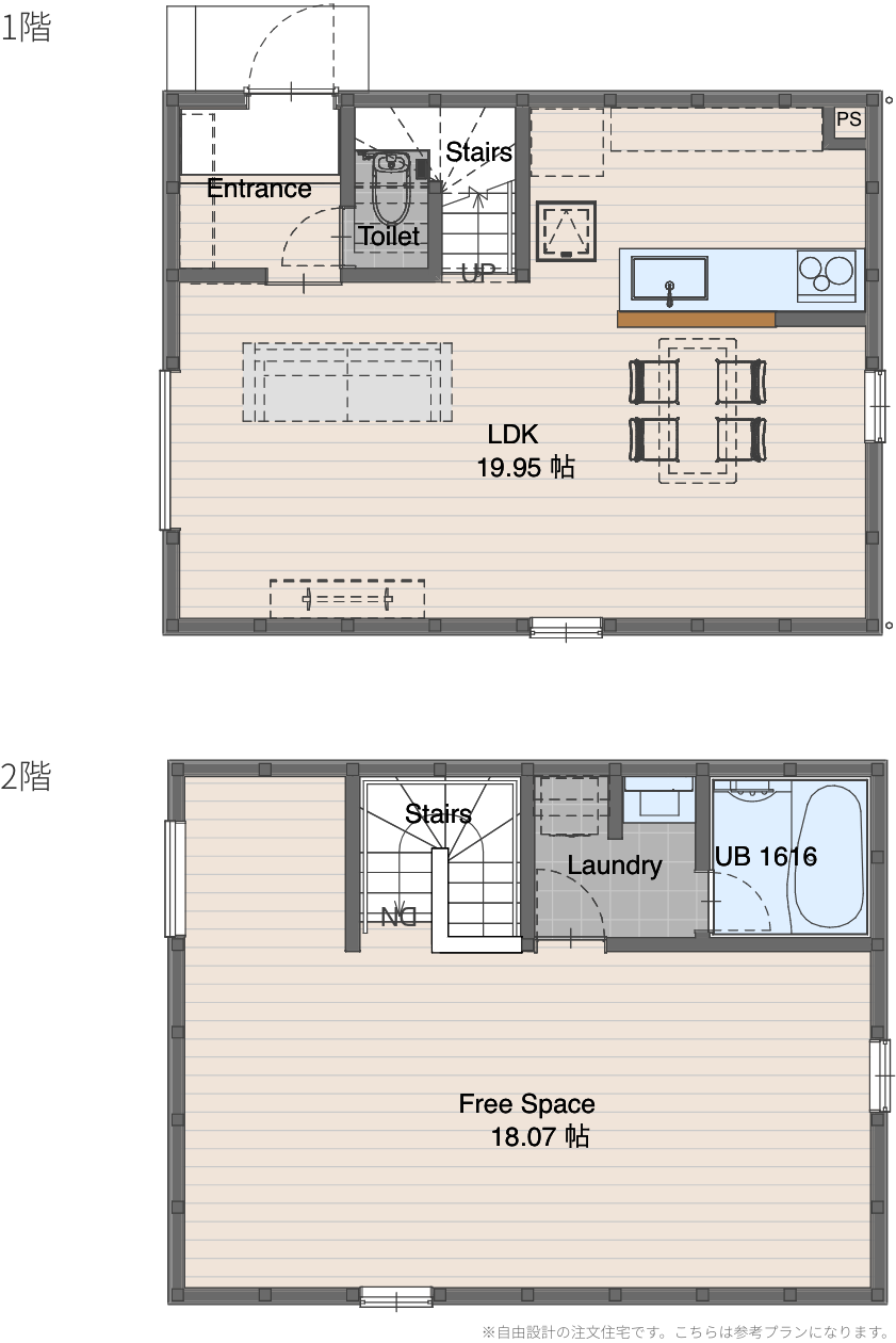 2階は個人の暮らし方や人数に合わせて家具等で間仕切る、