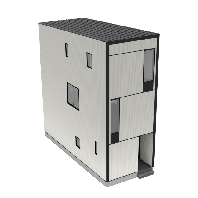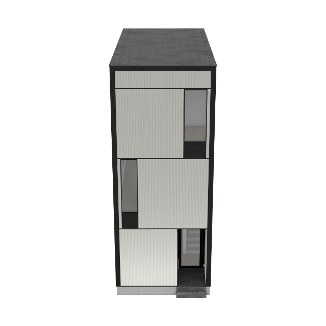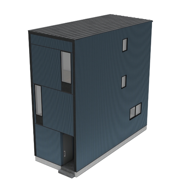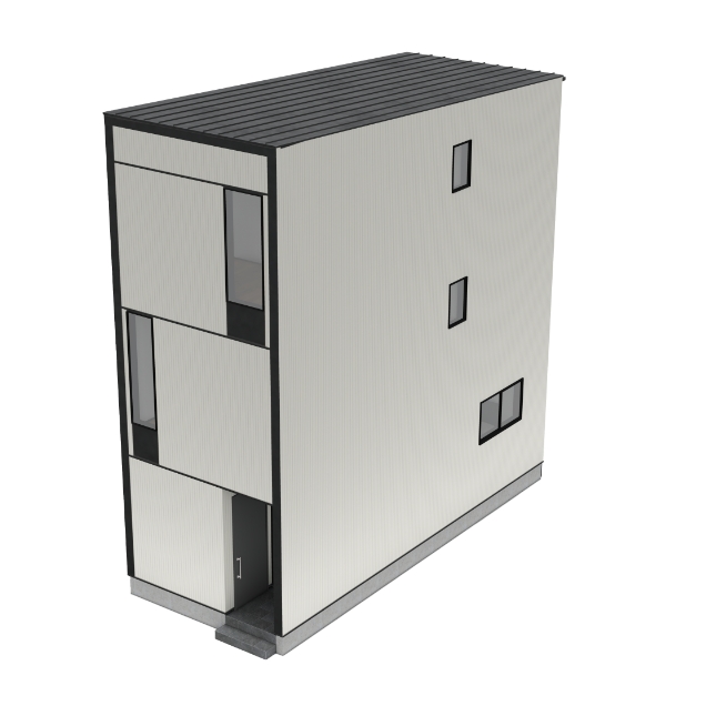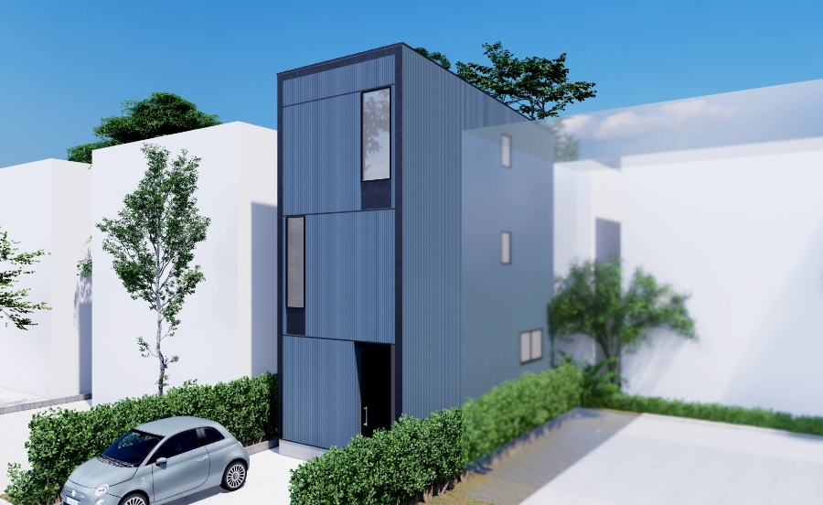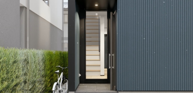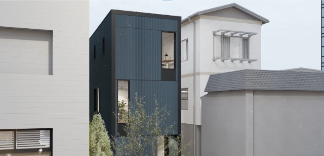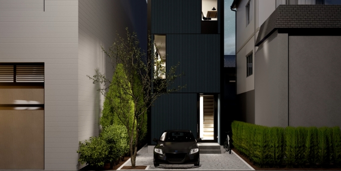 建物の幅が狭いことを感じさせない存在感あるファサードに仕上げています。