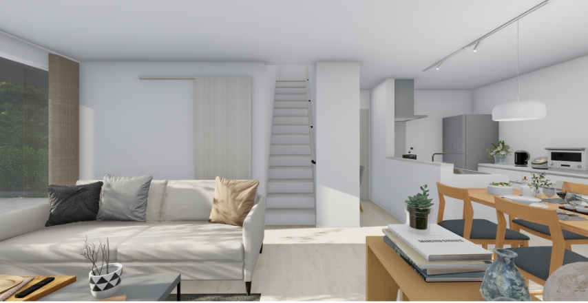 1階の20帖を超える大型LDKの中央に階段を備えることで、