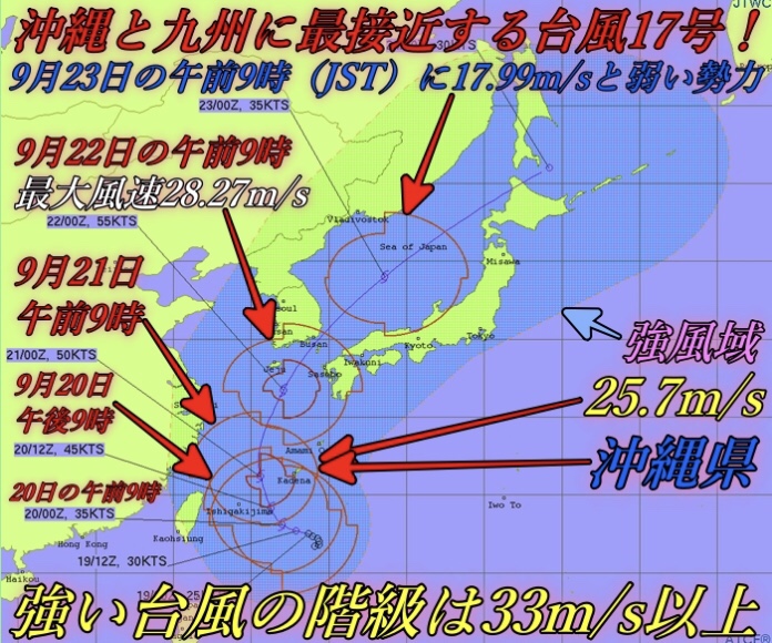 9月19日(木)15時、沖縄の南で発達中の熱帯低気圧が台風17号(ターファー)になりました。