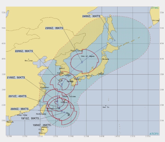 三連休初日に沖縄に接近したあとは東シナ海を北上し、22日(日)~23日(月)にかけて日本海へ進む予想です。九州など西日本でも大荒れの天気となるおそれがあります。