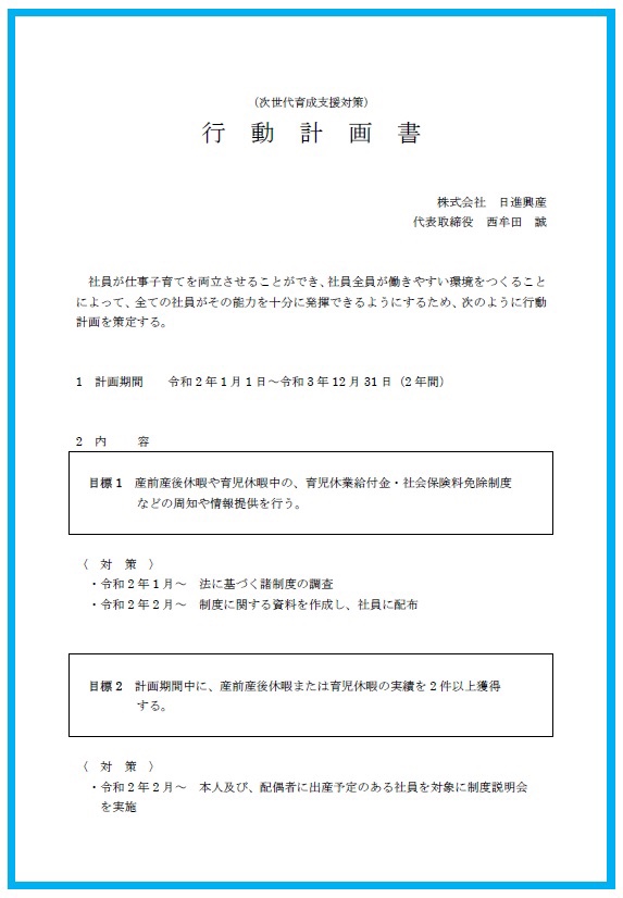 一般事業主行動計画の公表について株式会社日進興産は「次世代育成支援対策推進法」に基づき「一般事業主行動計画」を公表いたします。次世代育成支援対策推進法とは、次世代の社会を担う子どもたちが健やかに生まれ、育成される環境の整備を行うための法律です。この法律に基づき、当社も従業員が仕事と子育てを両立できるようか環境を整備する一端を担い、次世代育成支援対策として「一般事業主行動計画」を策定しております。◼️当社の取り組み◼️