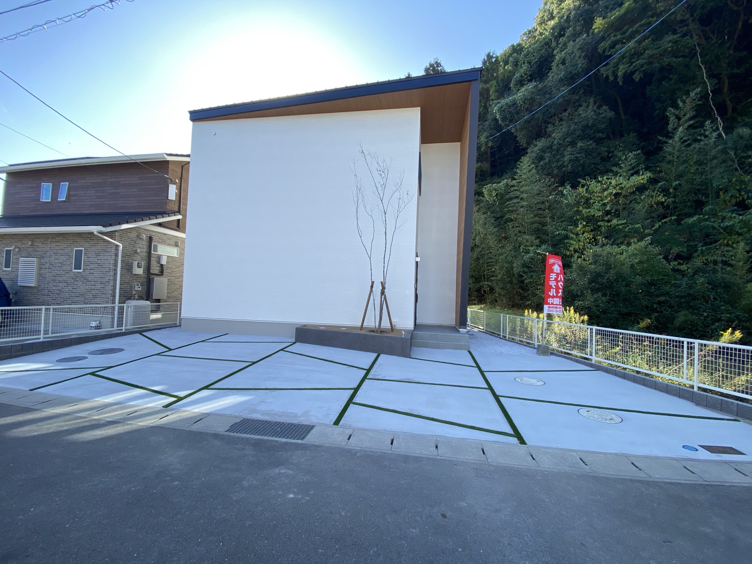 外観はシャープなフォルムで2階建3LDKです。リビングは広くて落ち着いた空間、ゆっくりくつろげます。見所たくさんございますので、是非、ご予約下さい。