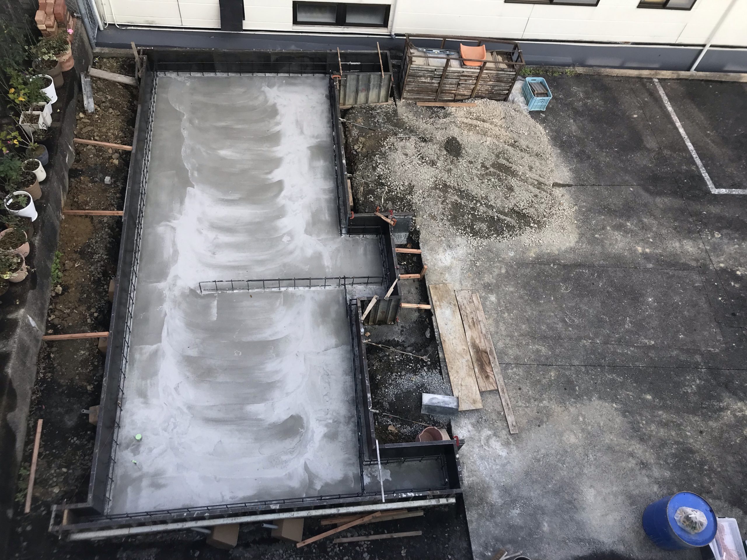 こんにちは建設部の木原です。事務所横の進捗報告です。土間コンクリート打って養生中です。