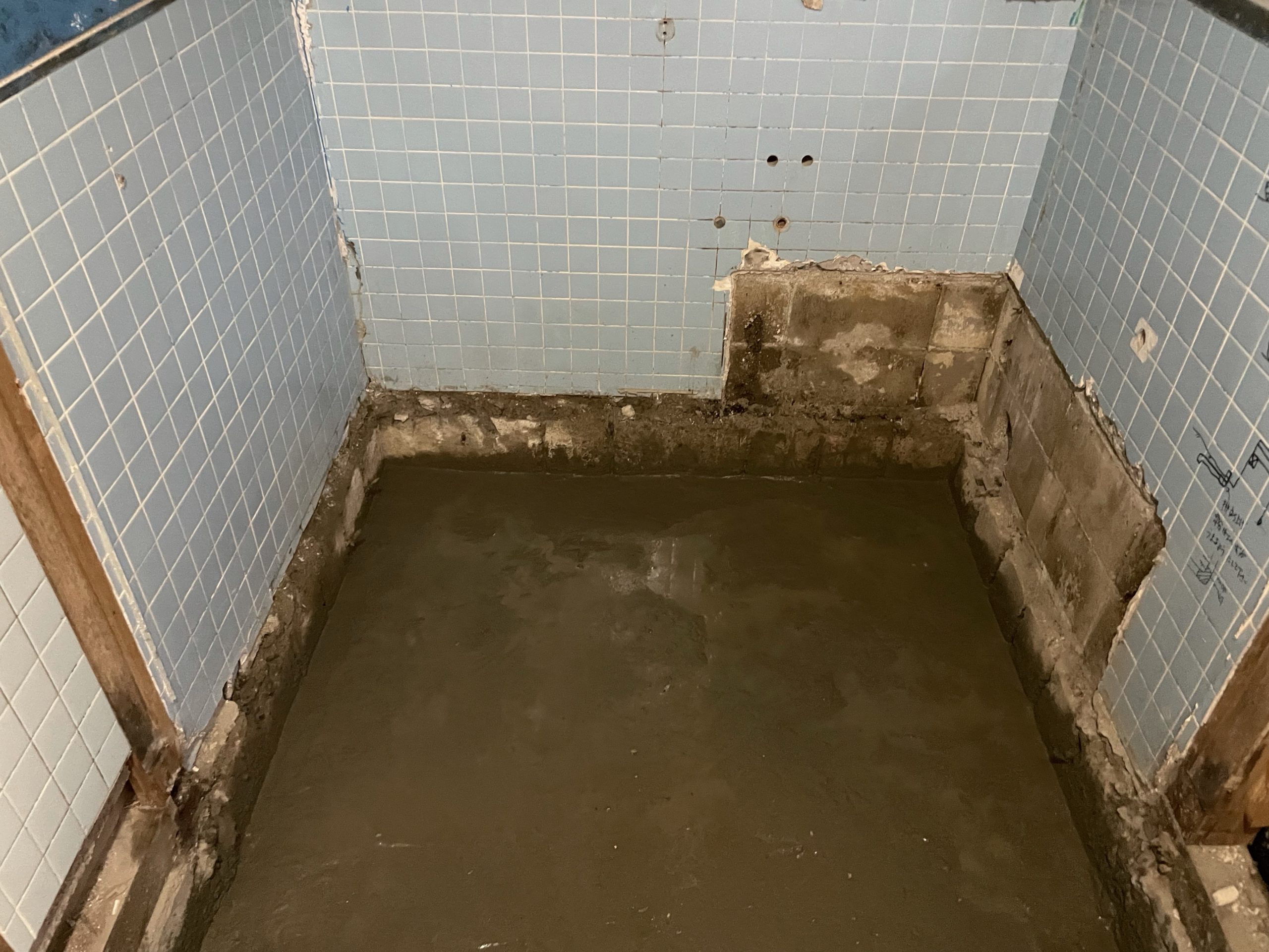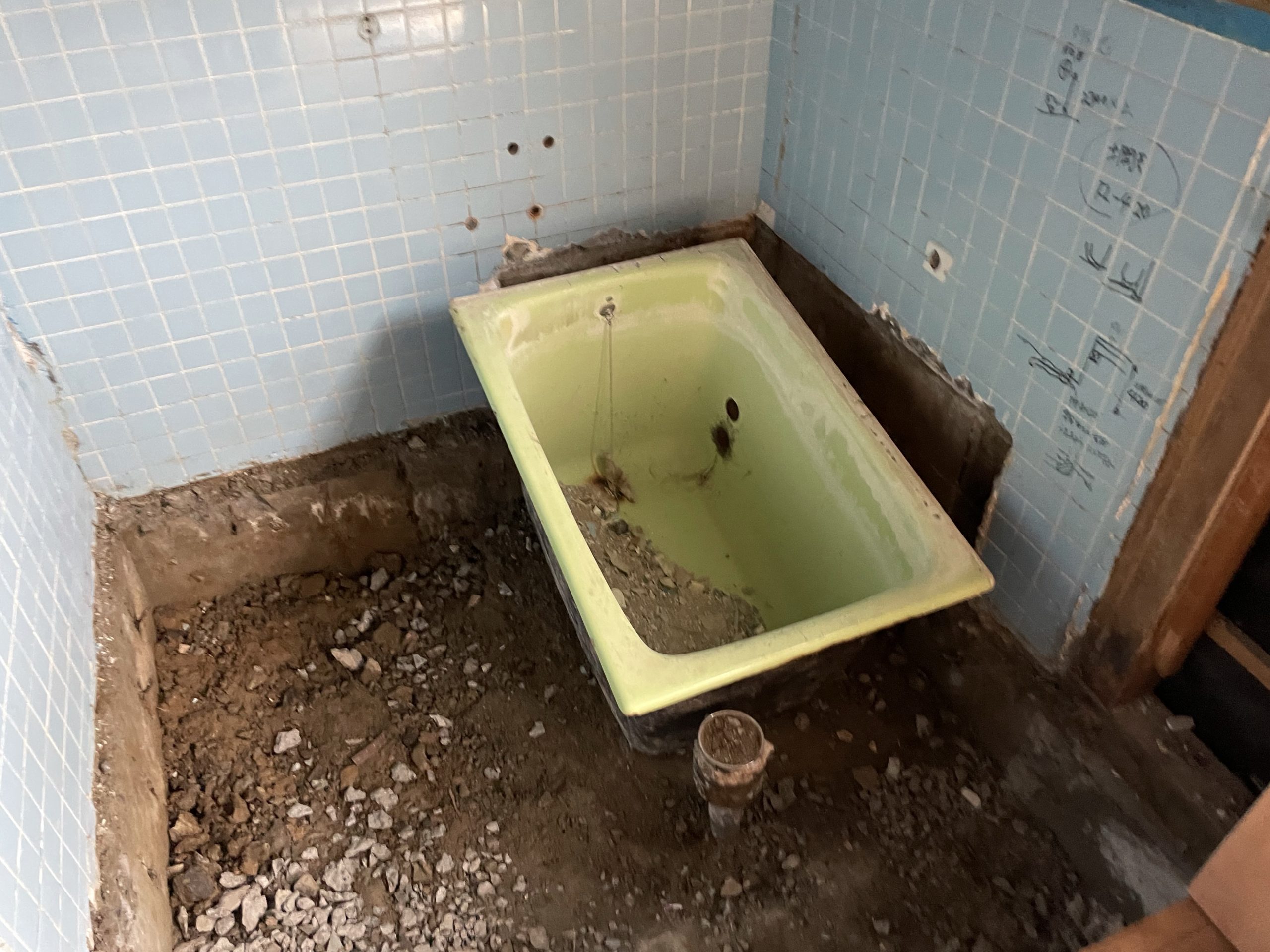 タイルをハツり壊していくのが大変な作業になります。浴室の風呂釜が見えて来ました✨
