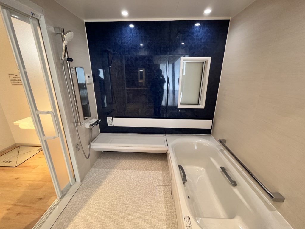 ベンチと浴槽が並んでいるのでベンチに腰掛けながらおしりをずらすだけで浴槽に入れます!