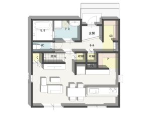 明るい空間で家族が生活出来、一階・二階とのつながり、省エネ性能を発揮する間取りです。