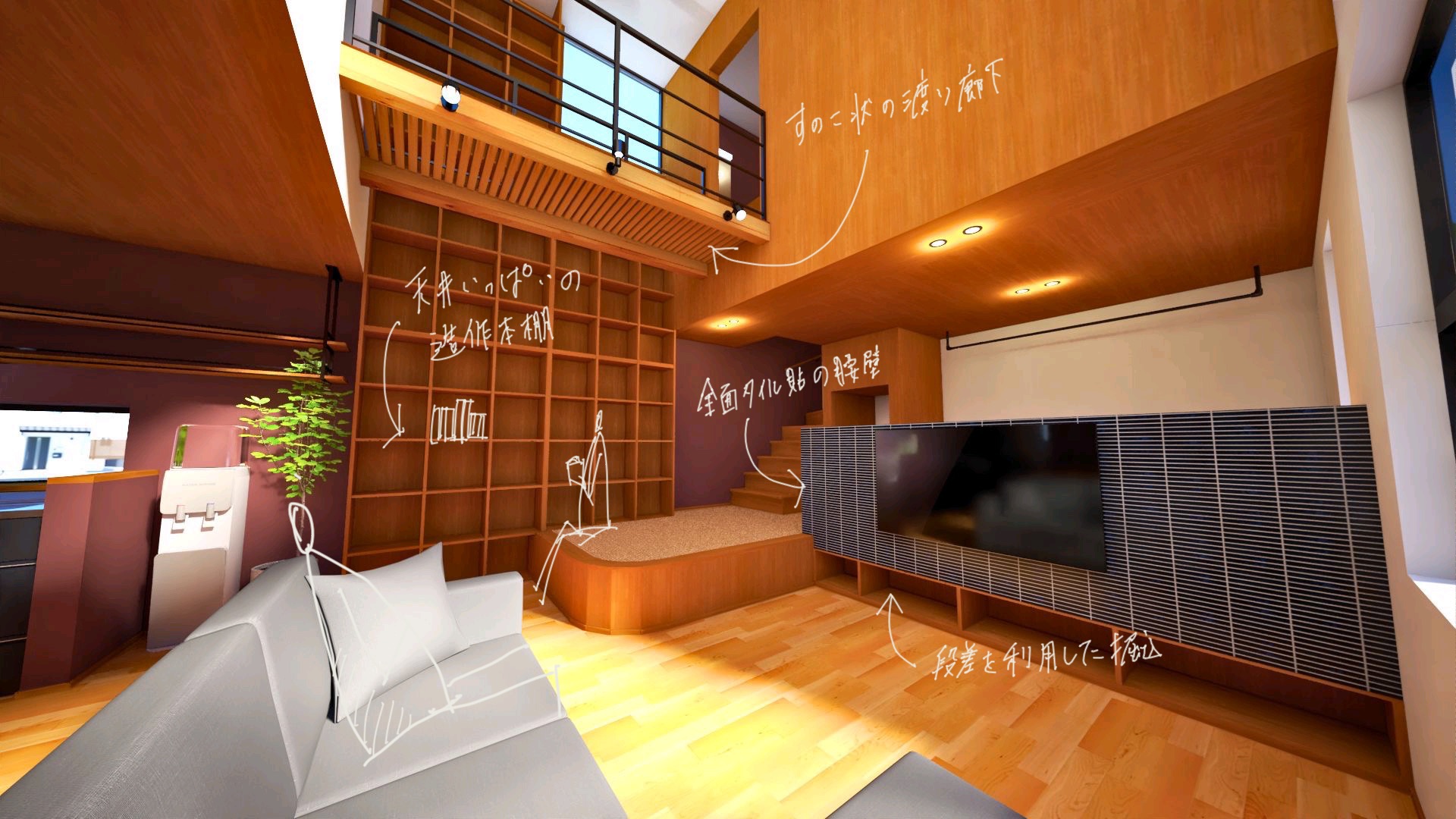 また、TVを設置する壁面には、腰壁の全面にタイルを張り付けました。これにより、奥にあるスタディーコーナーとは別空間のように感じられると同時につながりを感じることができます。スタディーコーナーとの段差を利用して、レコーダーやゲーム機などを設置するためのスペースを確保することもできます。