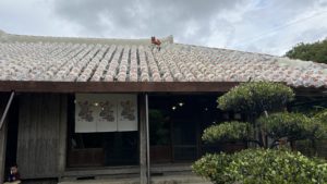 ここは国の登録有形文化財に指定されている古民家で、石垣に囲まれさらに入口正面には風よけの石垣がある伝統的な沖縄建築の建物内で食事ができるところでした