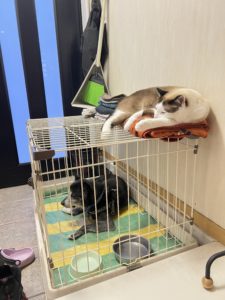 寝床を変えたんですが、中にいるニャンコ達とは仲良しで、ニャンコ3匹の中で、この子だけが