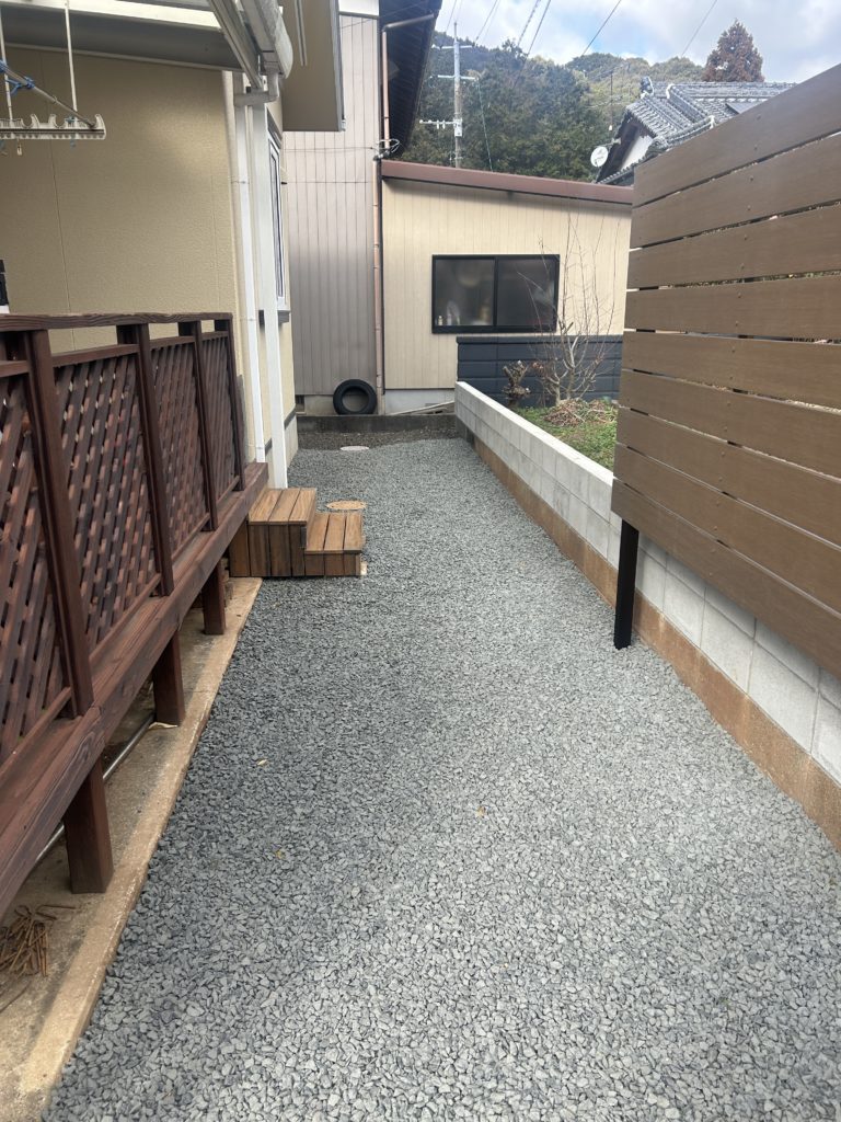 防犯用に砂利をきれいに敷き込みました