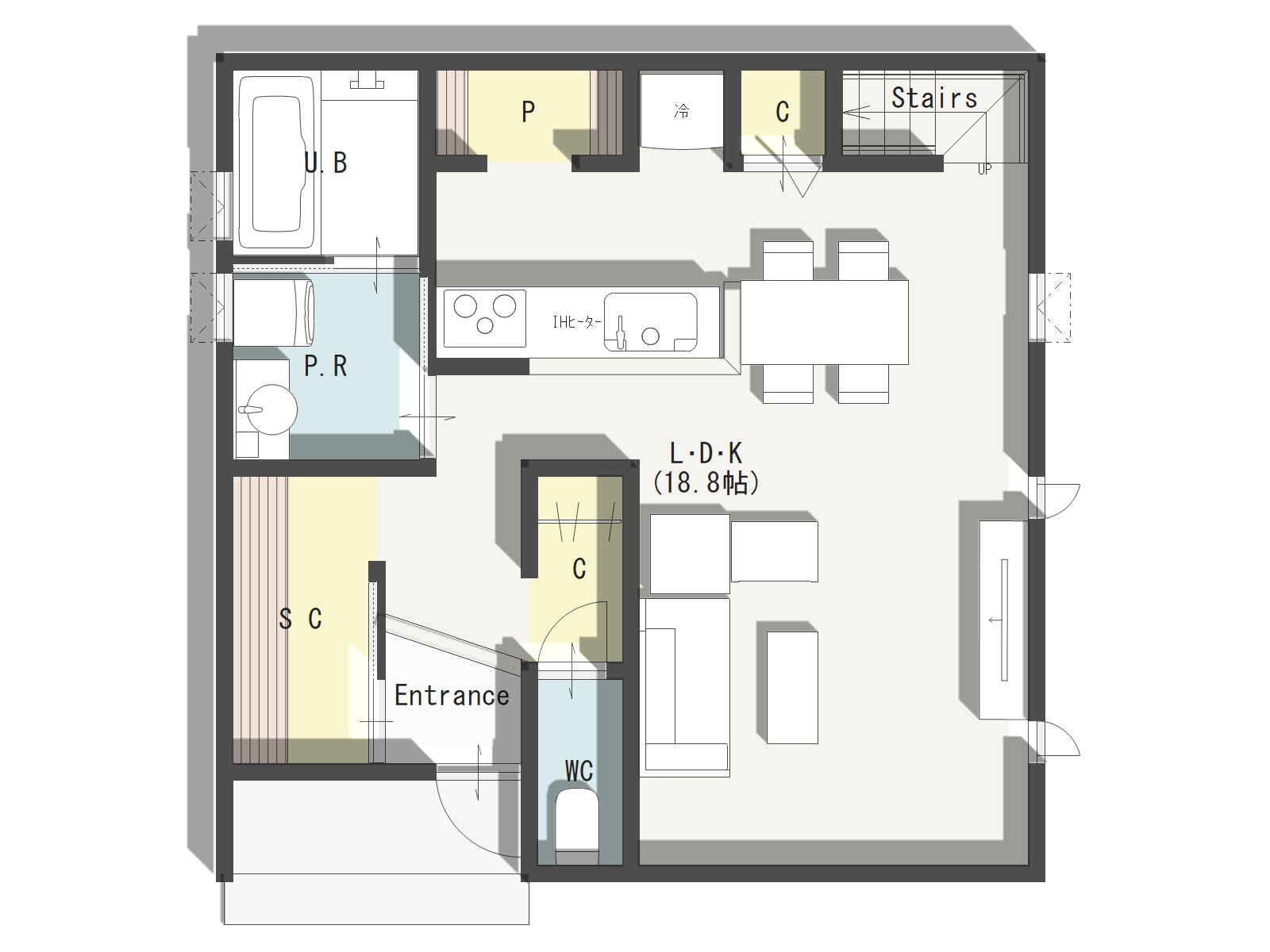 1階はリビング階段・シューズクローク・パントレー・階段下収納。コンパクト設計でありながら、機能性・十分な収納量を確保。