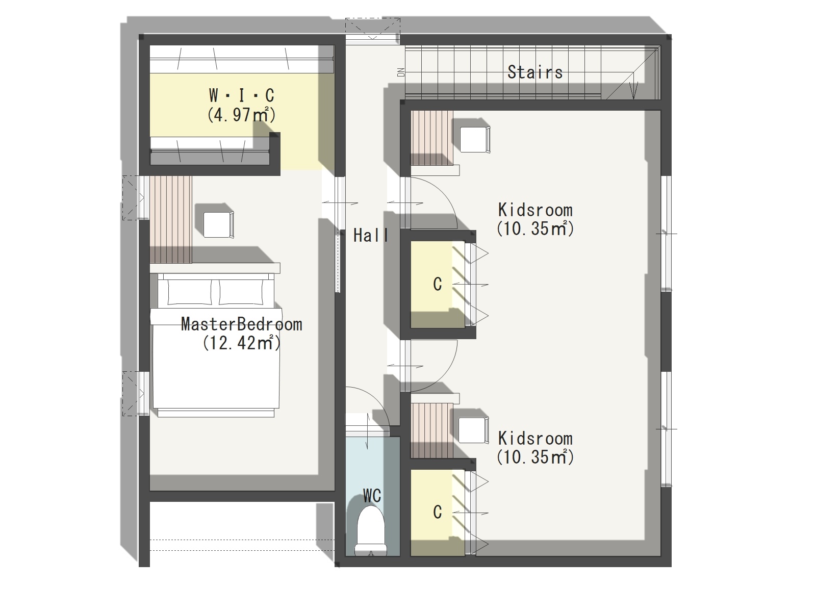 2階は寝室にウォークインクローゼット・ワークスペースを設け、子供部屋は将来仕切可能な部屋として、デスクとクローゼットを装備しました。