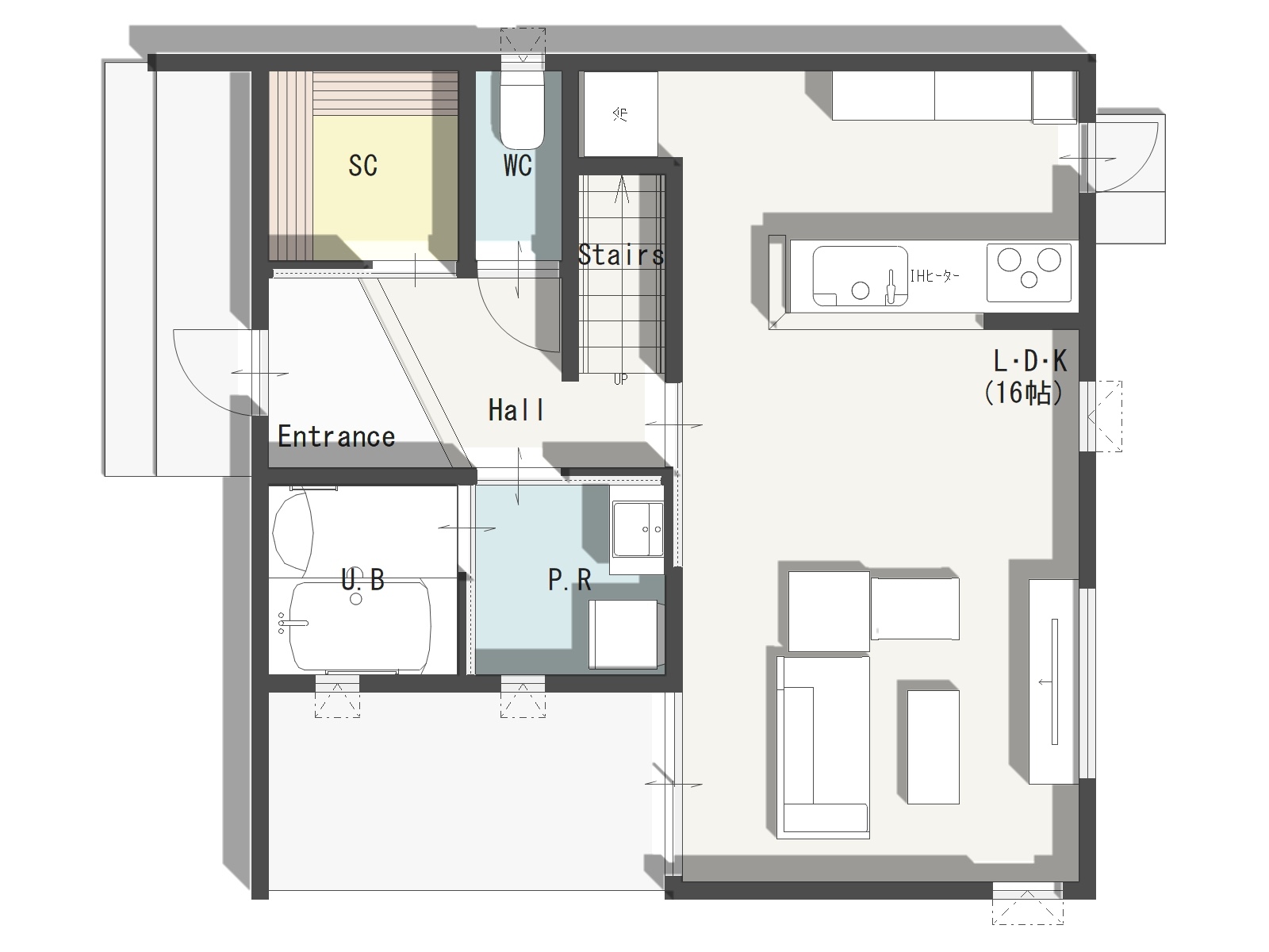 西玄関で南側に大きな倉庫があり、見られ感はないんですか、気になる為、閉じて、東側は見通しが良くて、東側に開いています。2階は3部屋で