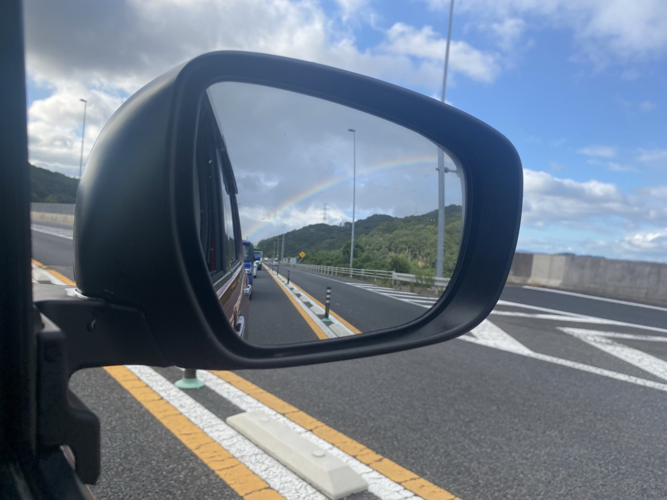 先日出勤しているとクルマのサイドミラーに虹が映ってました!